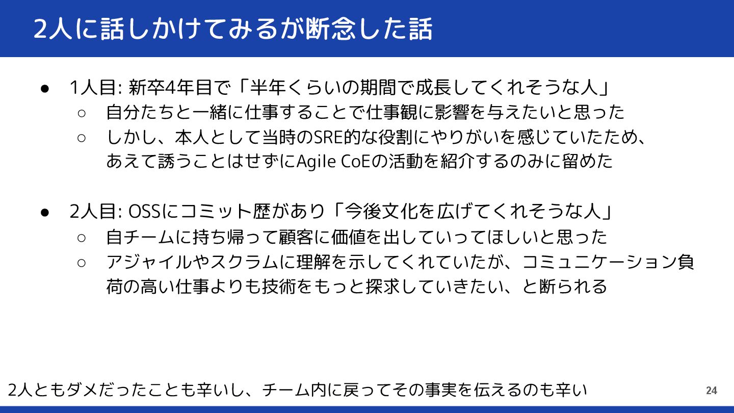 2人に話しかけてみるが断念した話 • 1人目: 新卒4年目で「半年くらいの期間で成長してくれそうな人」 ◦ 自分たちと一緒に仕事することで仕事観に影響を与えたいと思った ◦ しかし、本人として当時のSRE的な役割にやりがいを感じていたため、 あえて誘うことはせずにAgile CoEの活動を紹介するのみに留めた