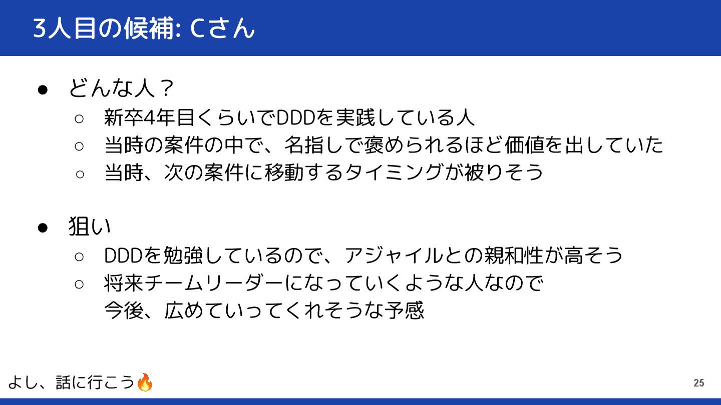 3人目の候補: Cさん • どんな人? ◦ 新卒4年目くらいでDDDを実践している人 ◦ 当時の案件の中で、名指しで褒められるほど価値を出していた ◦ 当時、次の案件に移動するタイミングが被りそう