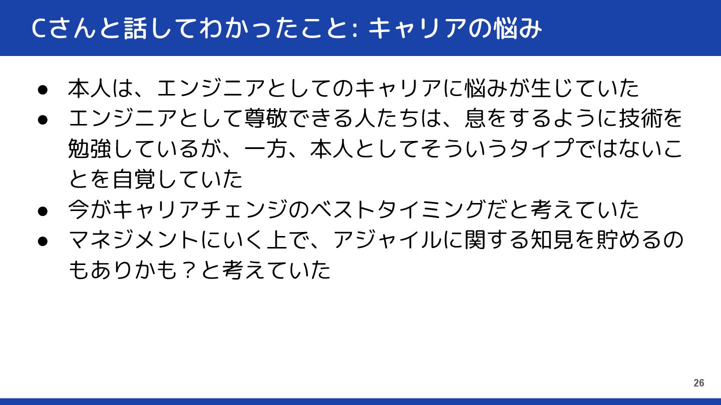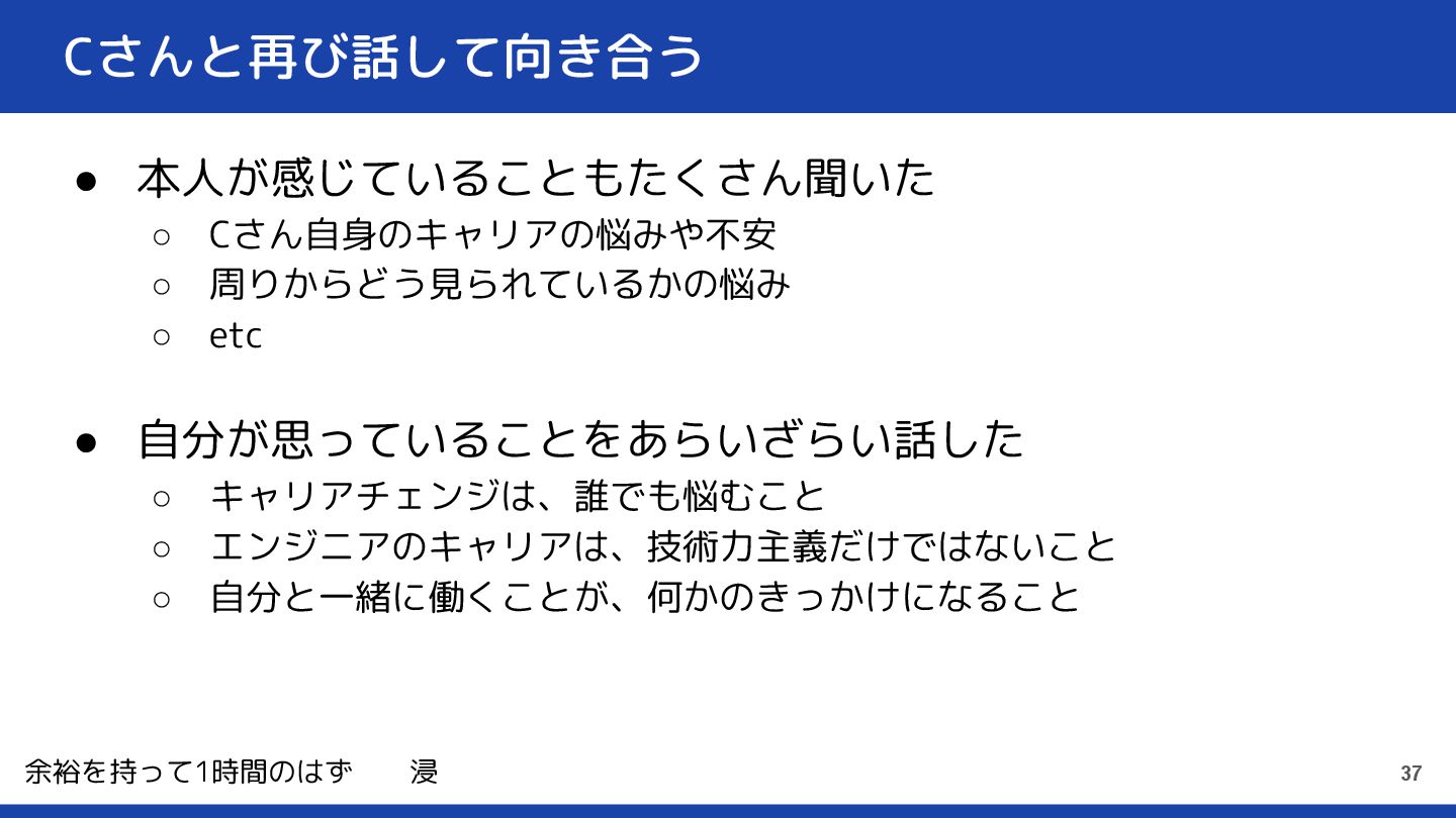 Cさんと再び話して向き合う • 本人が感じていることもたくさん聞いた ◦ Cさん自身のキャリアの悩みや不安 ◦ 周りからどう見られているかの悩み ◦ etc •