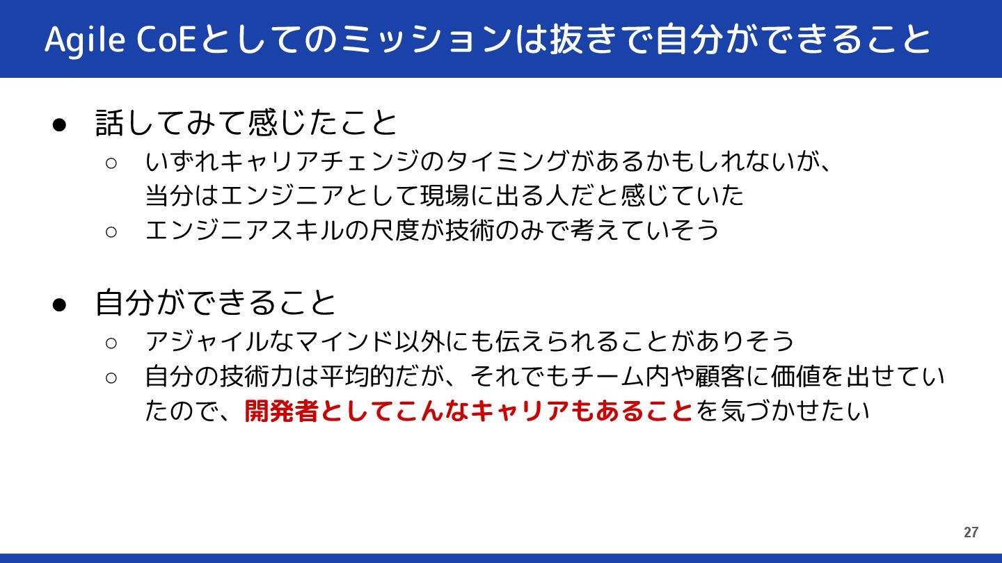 自分ができること ◦ アジャイルなマインド以外にも伝えられることがありそう ◦ 自分の技術力は平均的だが、それでもチーム内や顧客に価値を出せてい たので、開発者としてこんなキャリアもあることを気づかせたい 27