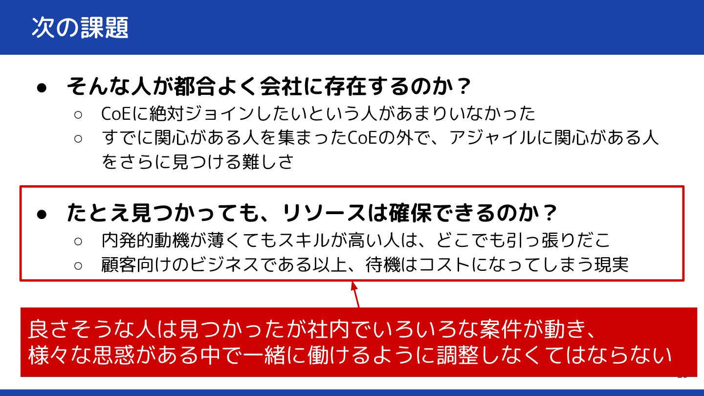 次の課題 • そんな人が都合よく会社に存在するのか? ◦ CoEに絶対ジョインしたいという人があまりいなかった ◦ すでに関心がある人を集まったCoEの外で、アジャイルに関心がある人 をさらに見つける難しさ • たとえ見つかっても、リソースは確保できるのか?