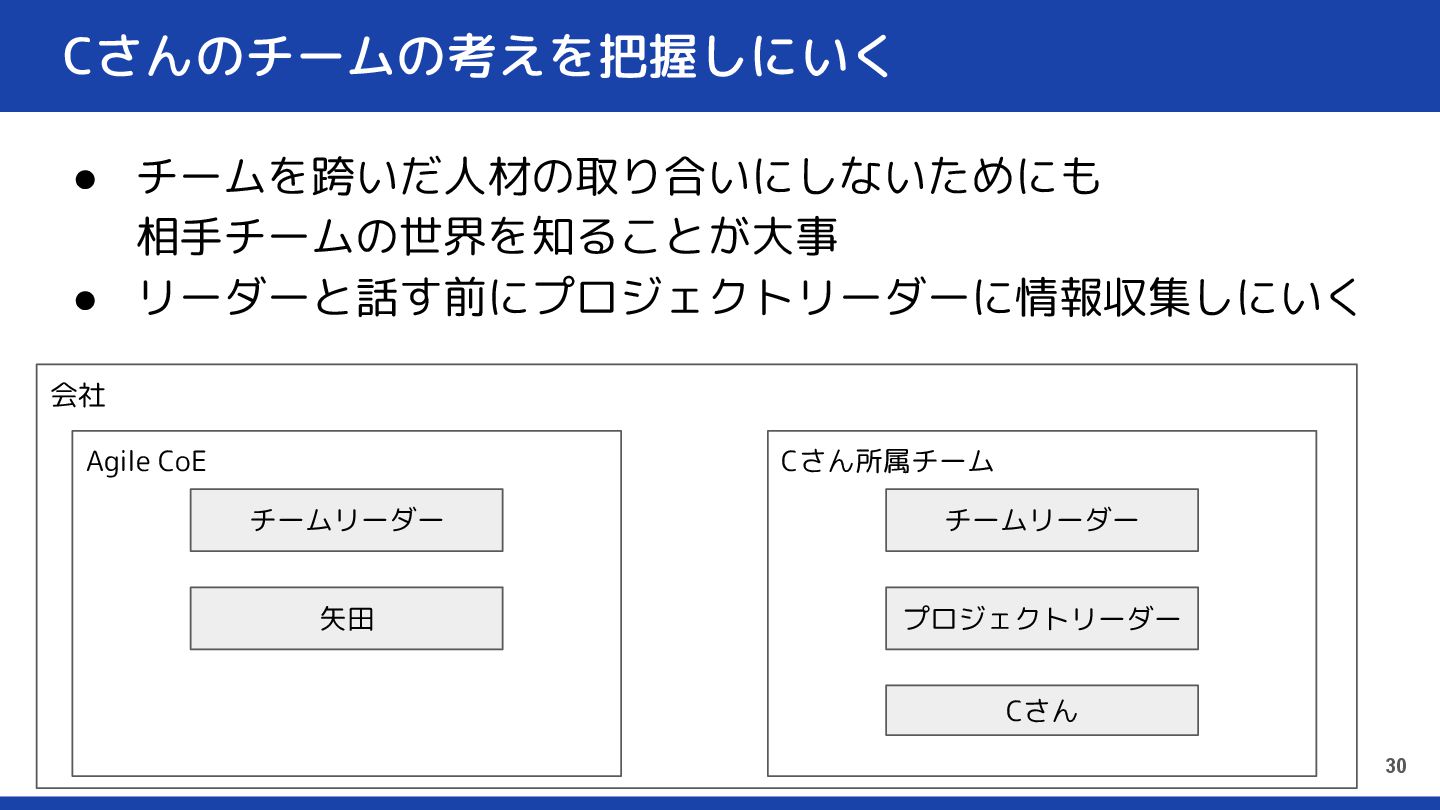 会社 Cさん所属チーム Agile CoE Cさんのチームの考えを把握しにいく • チームを跨いだ人材の取り合いにしないためにも 相手チームの世界を知ることが大事 • リーダーと話す前にプロジェクトリーダーに情報収集しにいく
