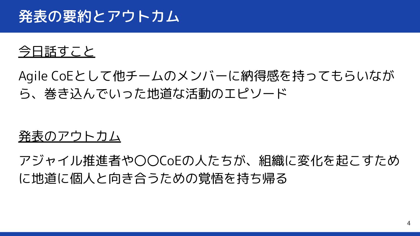 発表の要約とアウトカム 今日話すこと Agile CoEとして他チームのメンバーに納得感を持ってもらいなが ら、巻き込んでいった地道な活動のエピソード 発表のアウトカム アジャイル推進者や〇〇CoEの人たちが、組織に変化を起こすため に地道に個人と向き合うための覚悟を持ち帰る 4