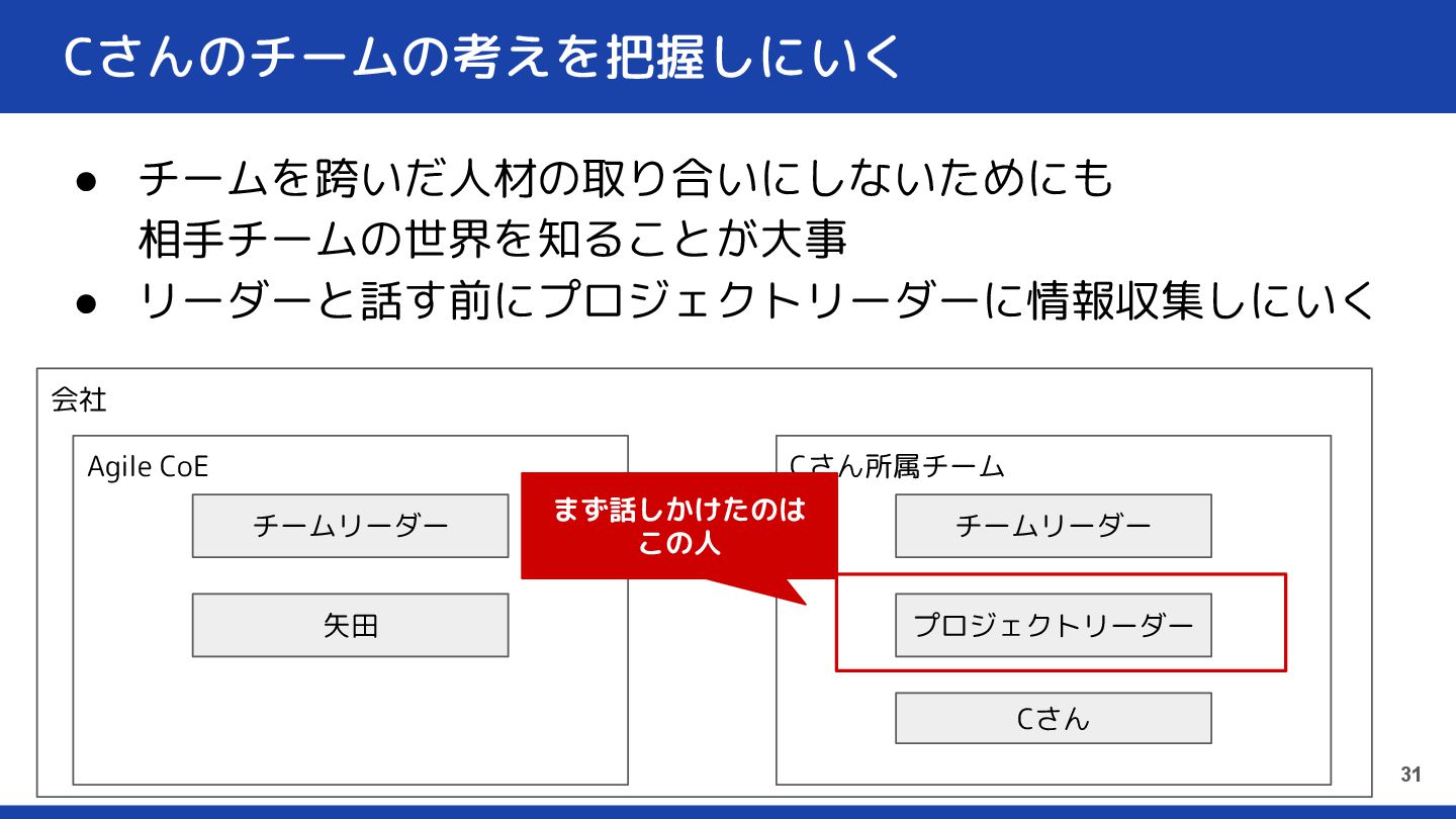 31 チームリーダー プロジェクトリーダー Cさん チームリーダー 矢田 まず話しかけたのは この人