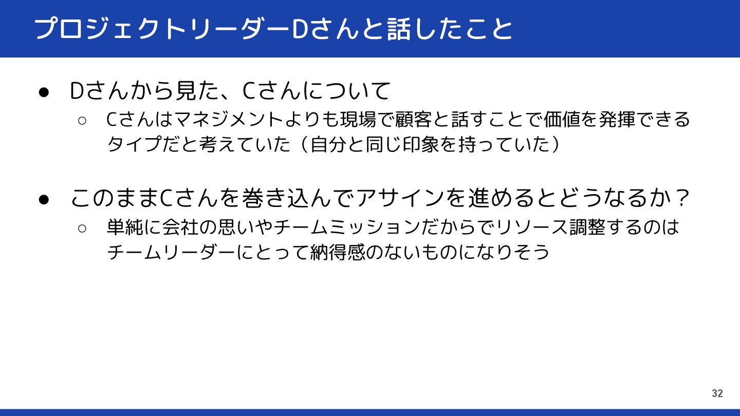 プロジェクトリーダーDさんと話したこと • Dさんから見た、Cさんについて ◦ Cさんはマネジメントよりも現場で顧客と話すことで価値を発揮できる タイプだと考えていた(自分と同じ印象を持っていた) • このままCさんを巻き込んでアサインを進めるとどうなるか? ◦ 単純に会社の思いやチームミッションだからでリソース調整するのは