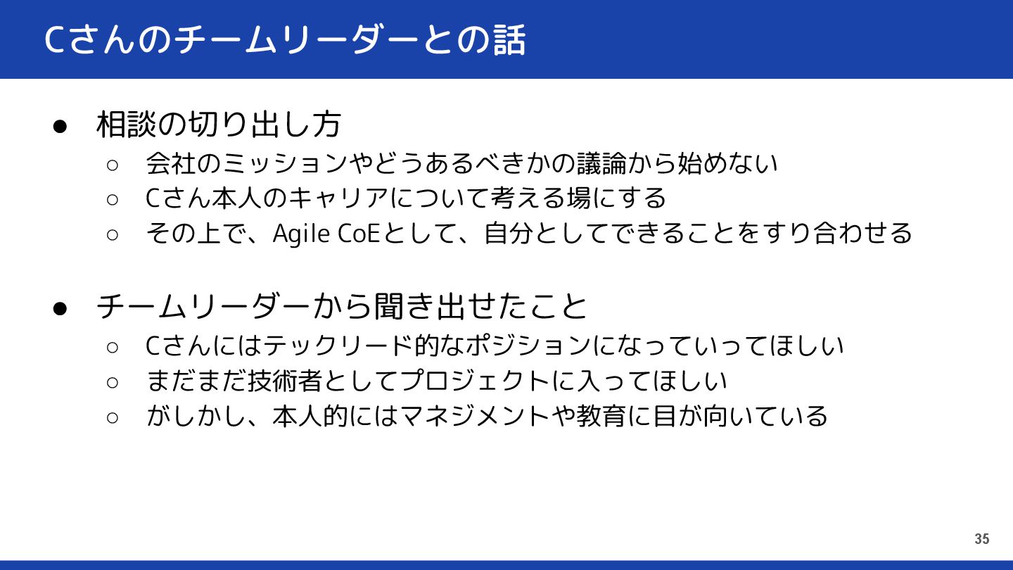 • チームリーダーから聞き出せたこと ◦ Cさんにはテックリード的なポジションになっていってほしい ◦ まだまだ技術者としてプロジェクトに入ってほしい ◦ がしかし、本人的にはマネジメントや教育に目が向いている 35