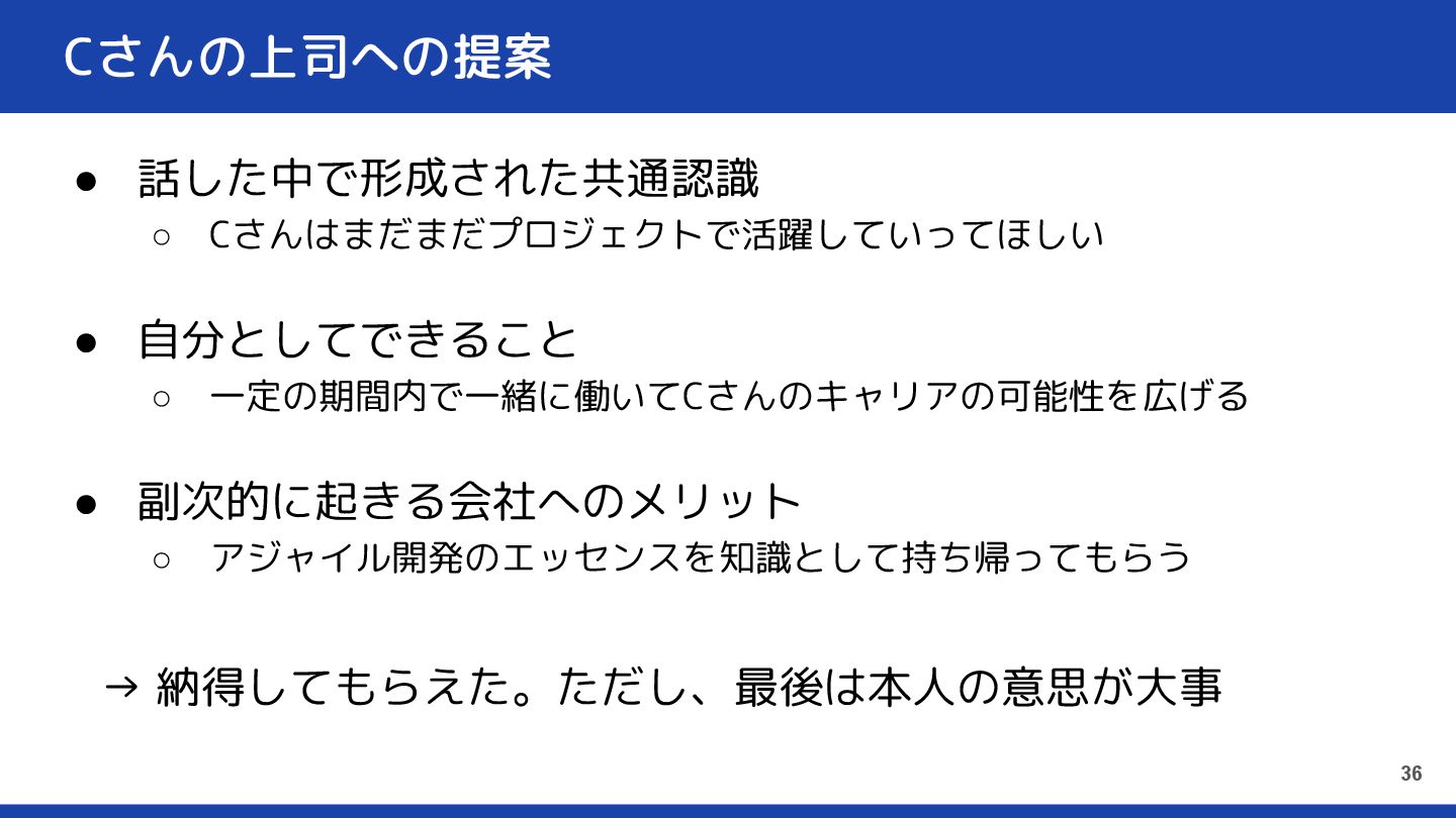 Cさんの上司への提案 • 話した中で形成された共通認識 ◦ Cさんはまだまだプロジェクトで活躍していってほしい • 自分としてできること ◦ 一定の期間内で一緒に働いてCさんのキャリアの可能性を広げる •