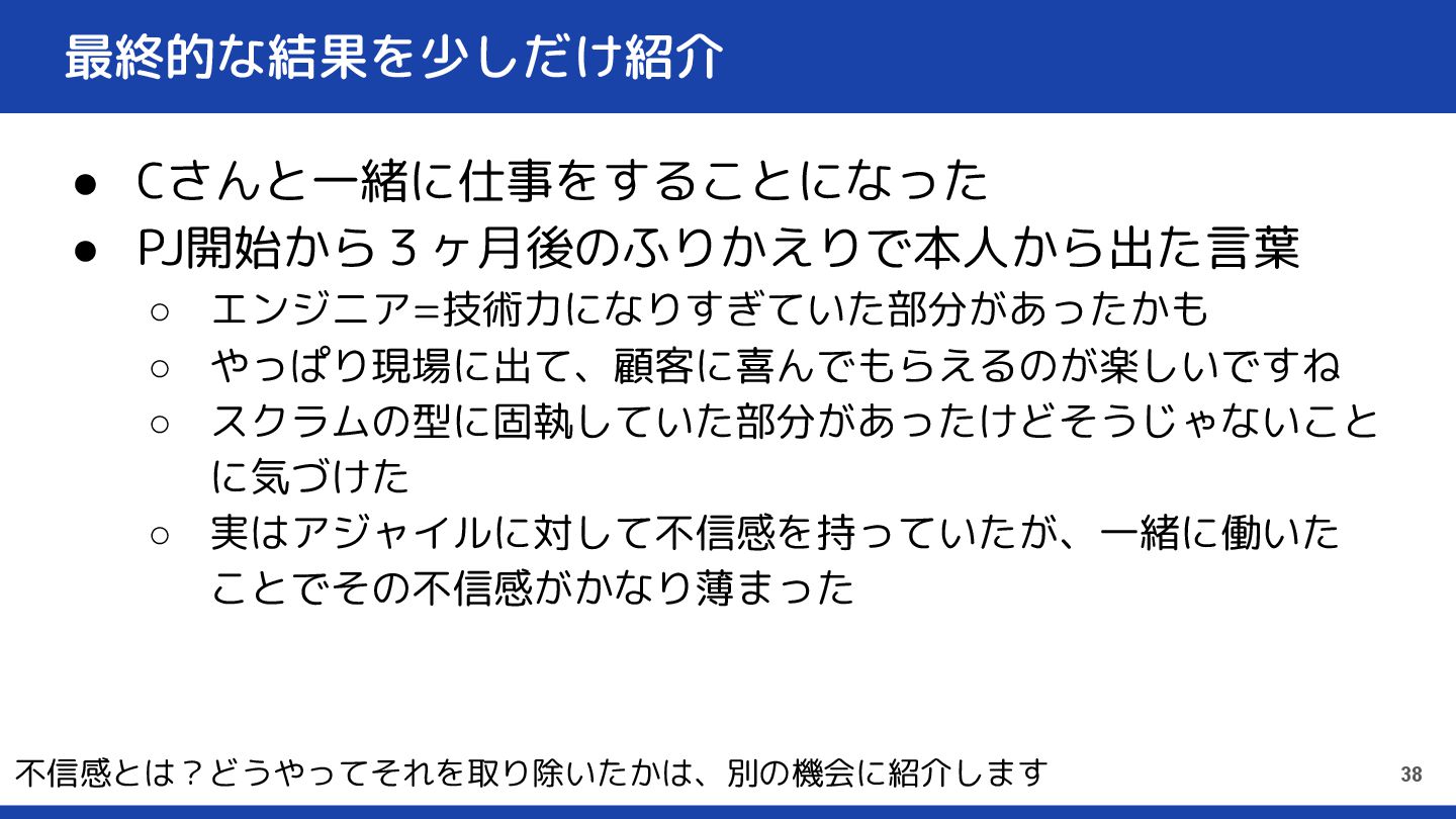 最終的な結果を少しだけ紹介 • Cさんと一緒に仕事をすることになった • PJ開始から3ヶ月後のふりかえりで本人から出た言葉 ◦ エンジニア=技術力になりすぎていた部分があったかも ◦ やっぱり現場に出て、顧客に喜んでもらえるのが楽しいですね ◦