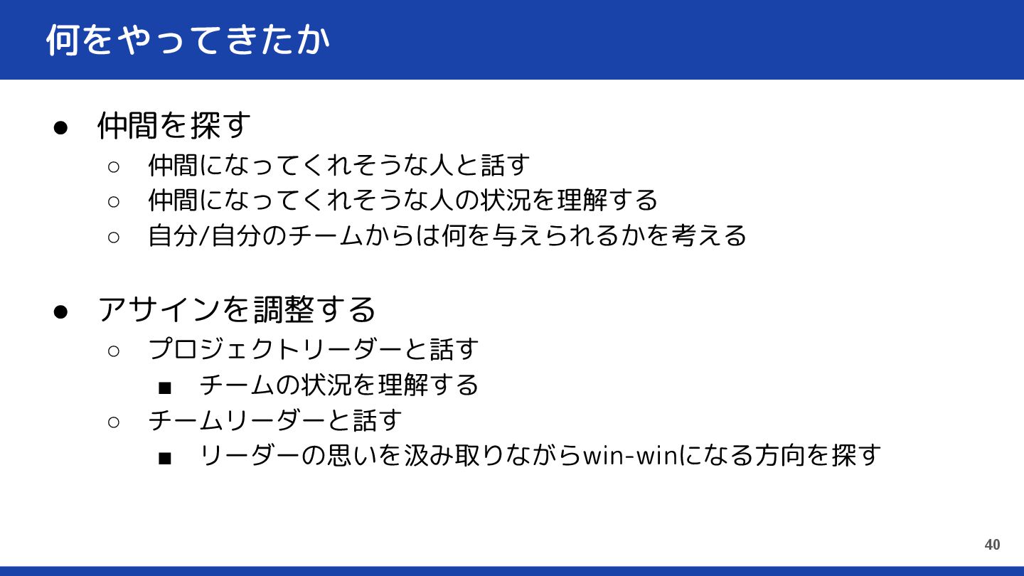 アサインを調整する ◦ プロジェクトリーダーと話す ▪ チームの状況を理解する ◦ チームリーダーと話す ▪ リーダーの思いを汲み取りながらwin-winになる方向を探す 40