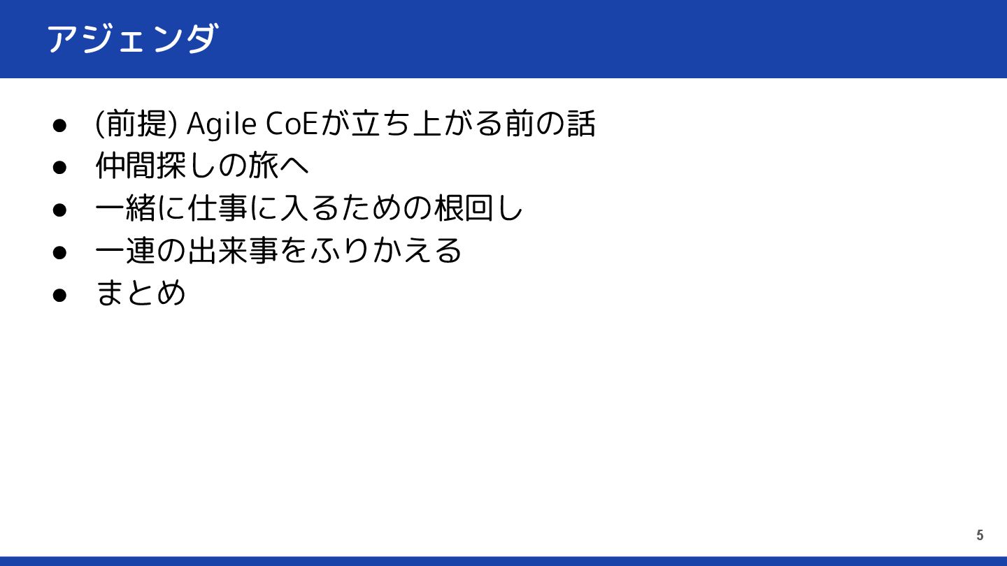 アジェンダ • (前提) Agile CoEが立ち上がる前の話 • 仲間探しの旅へ • 一緒に仕事に入るための根回し •