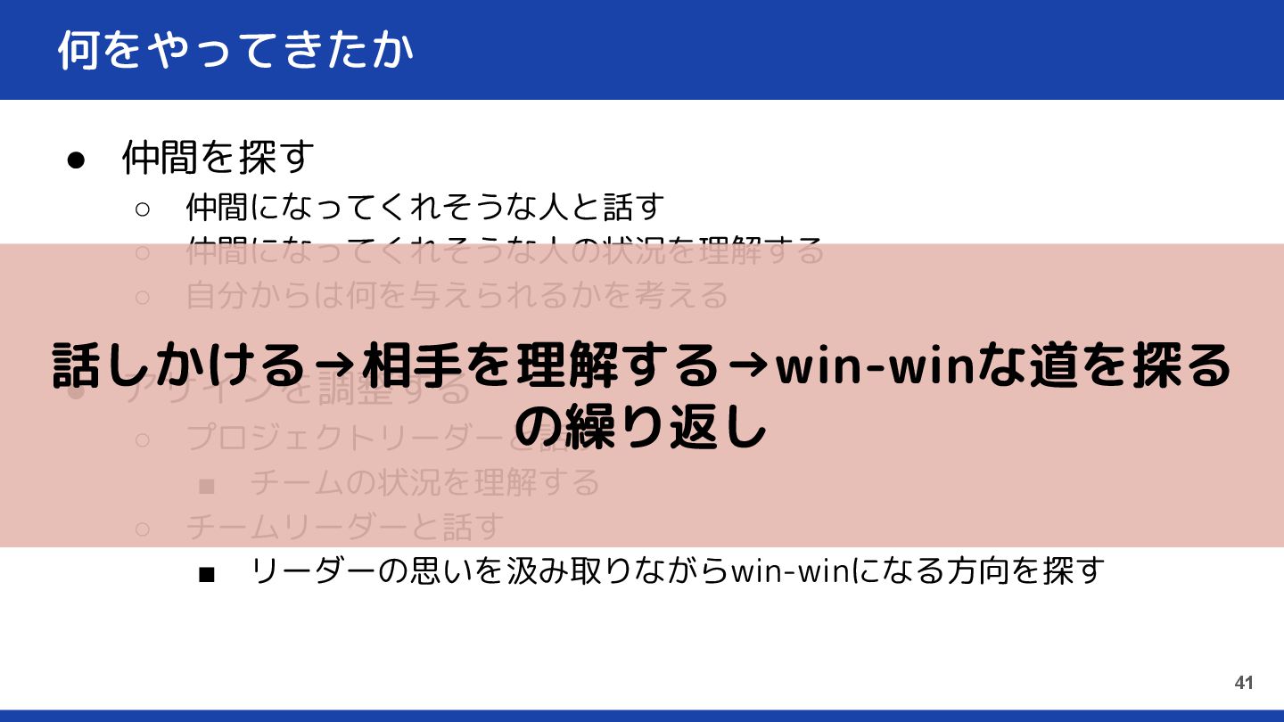 アサインを調整する ◦ プロジェクトリーダーと話す ▪ チームの状況を理解する ◦ チームリーダーと話す ▪ リーダーの思いを汲み取りながらwin-winになる方向を探す 41 話しかける→相手を理解する→win-winな道を探る の繰り返し