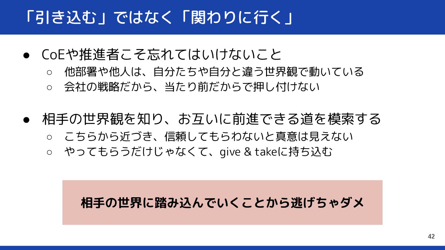 「引き込む」ではなく「関わりに行く」 • CoEや推進者こそ忘れてはいけないこと ◦ 他部署や他人は、自分たちや自分と違う世界観で動いている ◦ 会社の戦略だから、当たり前だからで押し付けない • 相手の世界観を知り、お互いに前進できる道を模索する ◦