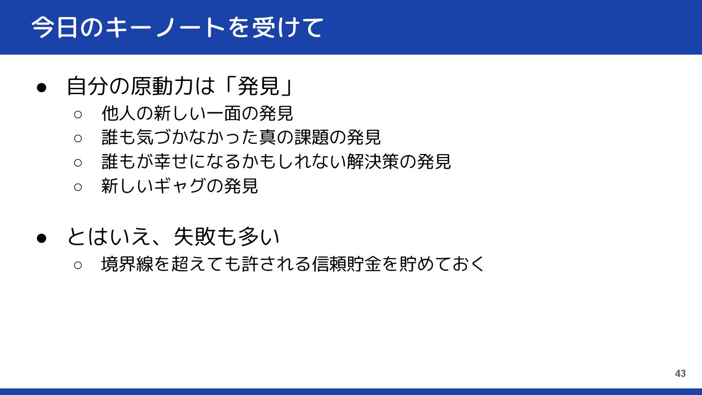 今日のキーノートを受けて • 自分の原動力は「発見」 ◦ 他人の新しい一面の発見 ◦ 誰も気づかなかった真の課題の発見 ◦ 誰もが幸せになるかもしれない解決策の発見 ◦