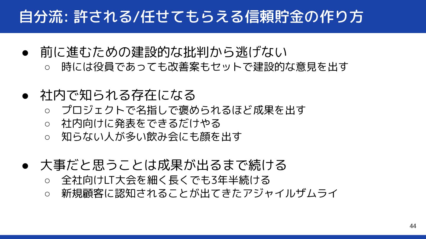 自分流: 許される/任せてもらえる信頼貯金の作り方 • 前に進むための建設的な批判から逃げない ◦ 時には役員であっても改善案もセットで建設的な意見を出す • 社内で知られる存在になる ◦ プロジェクトで名指しで褒められるほど成果を出す