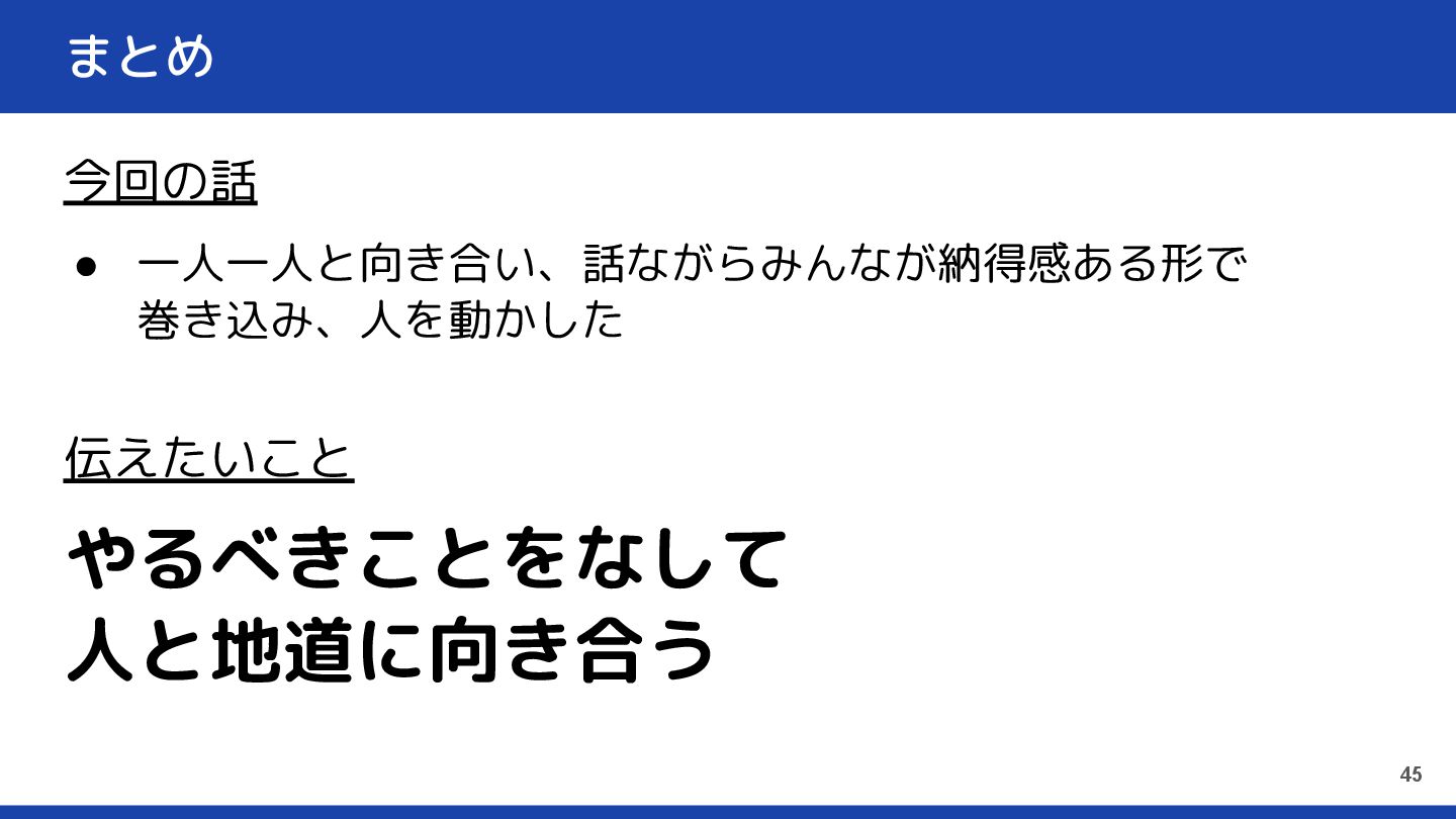 まとめ 今回の話 • 一人一人と向き合い、話ながらみんなが納得感ある形で 巻き込み、人を動かした 伝えたいこと やるべきことをなして 人と地道に向き合う 45