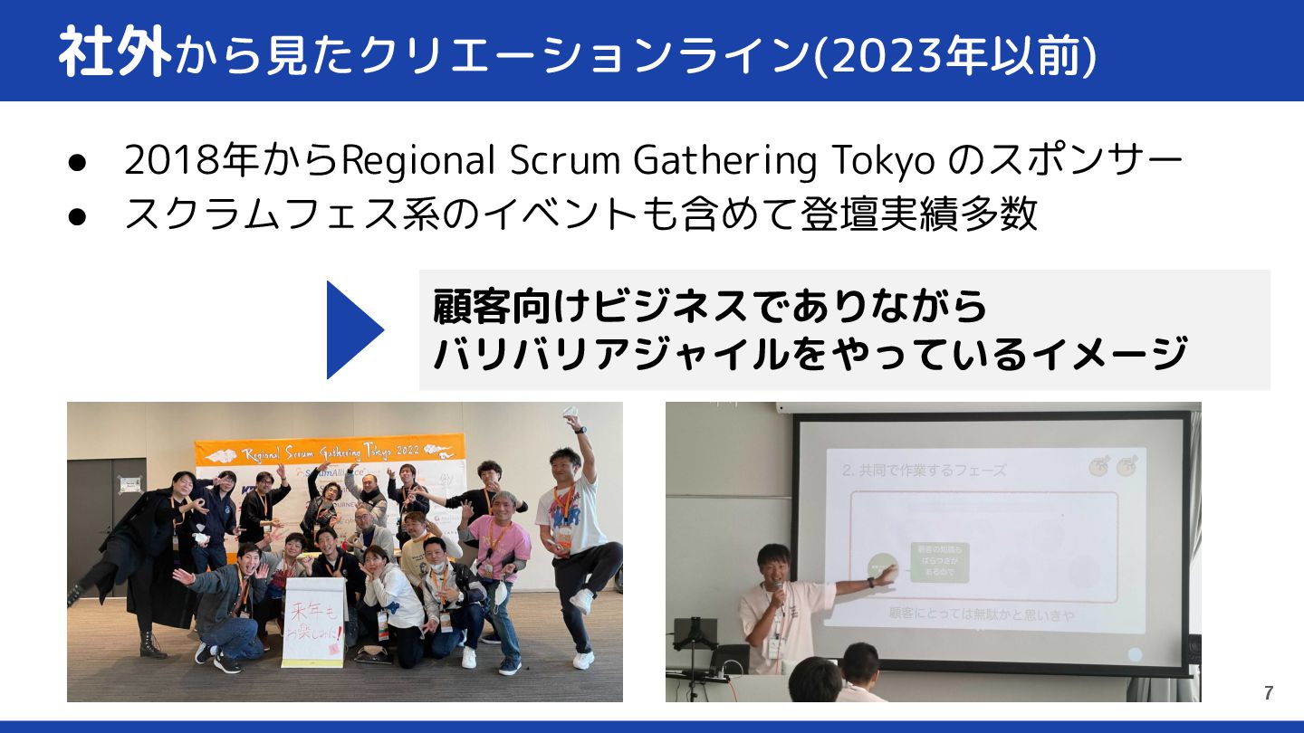 社内から見たクリエーションライン(2023年以前) • イベントに出ている一部のメンバーのみアジャイルに興味 • 現場のエンジニア「アジャイル?そんなこと言ってられん…」 • マネージャー層「あそこは楽しそうにやっているよね…」 • 社内のアジャイルコーチ「アジャイルですごい会社と認知され ているのに、実際の中身は違うところもあり悩ましい」