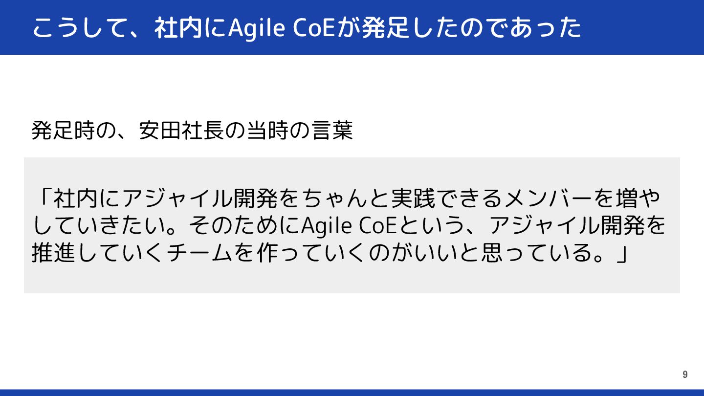 こうして、社内にAgile CoEが発足したのであった 発足時の、安田社長の当時の言葉 9 「社内にアジャイル開発をちゃんと実践できるメンバーを増や していきたい。そのためにAgile CoEという、アジャイル開発を 推進していくチームを作っていくのがいいと思っている。」