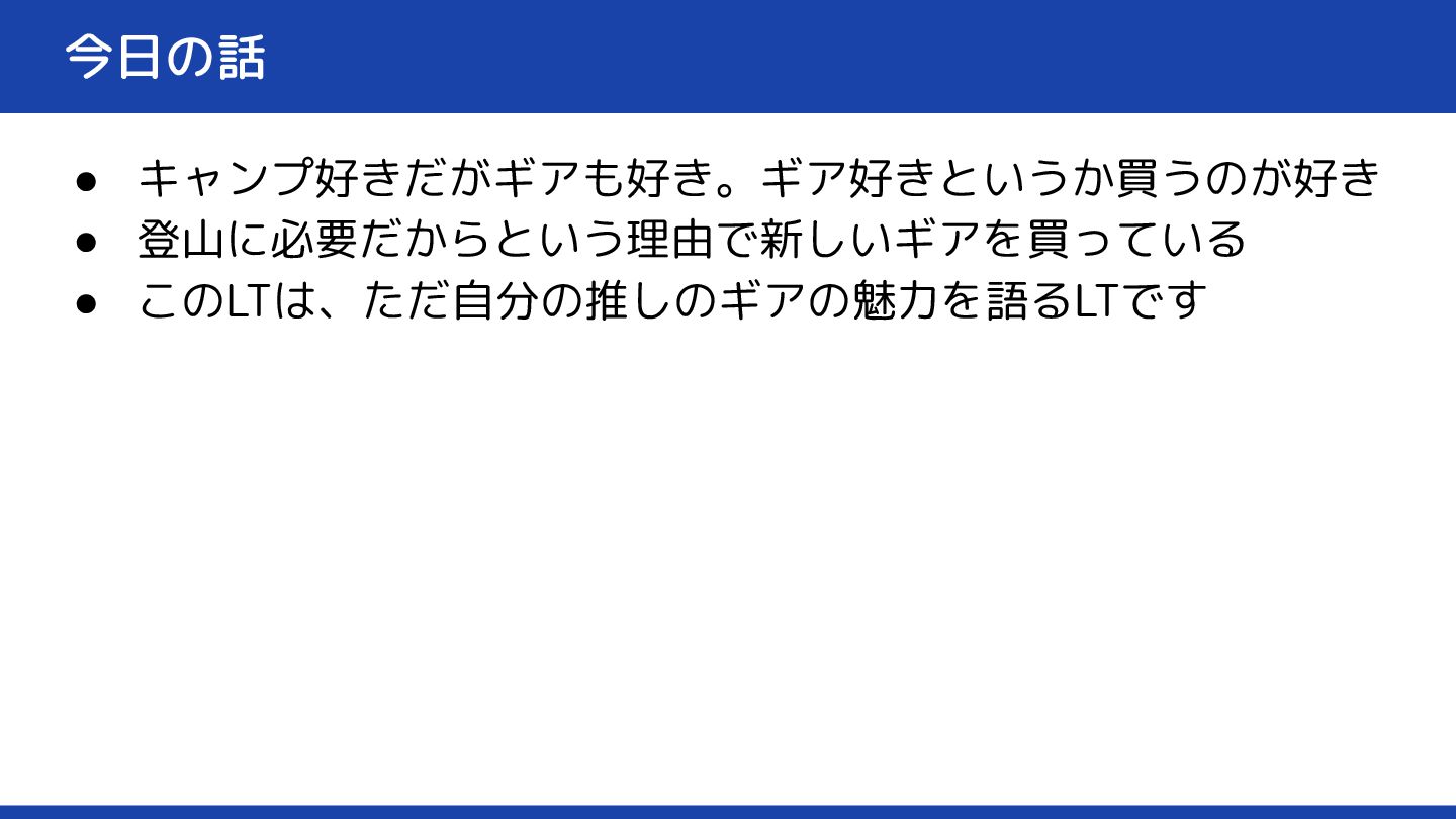 今日の話 • キャンプ好きだがギアも好き。ギア好きというか買うのが好き • 登山に必要だからという理由で新しいギアを買っている • このLTは、ただ自分の推しのギアの魅力を語るLTです
