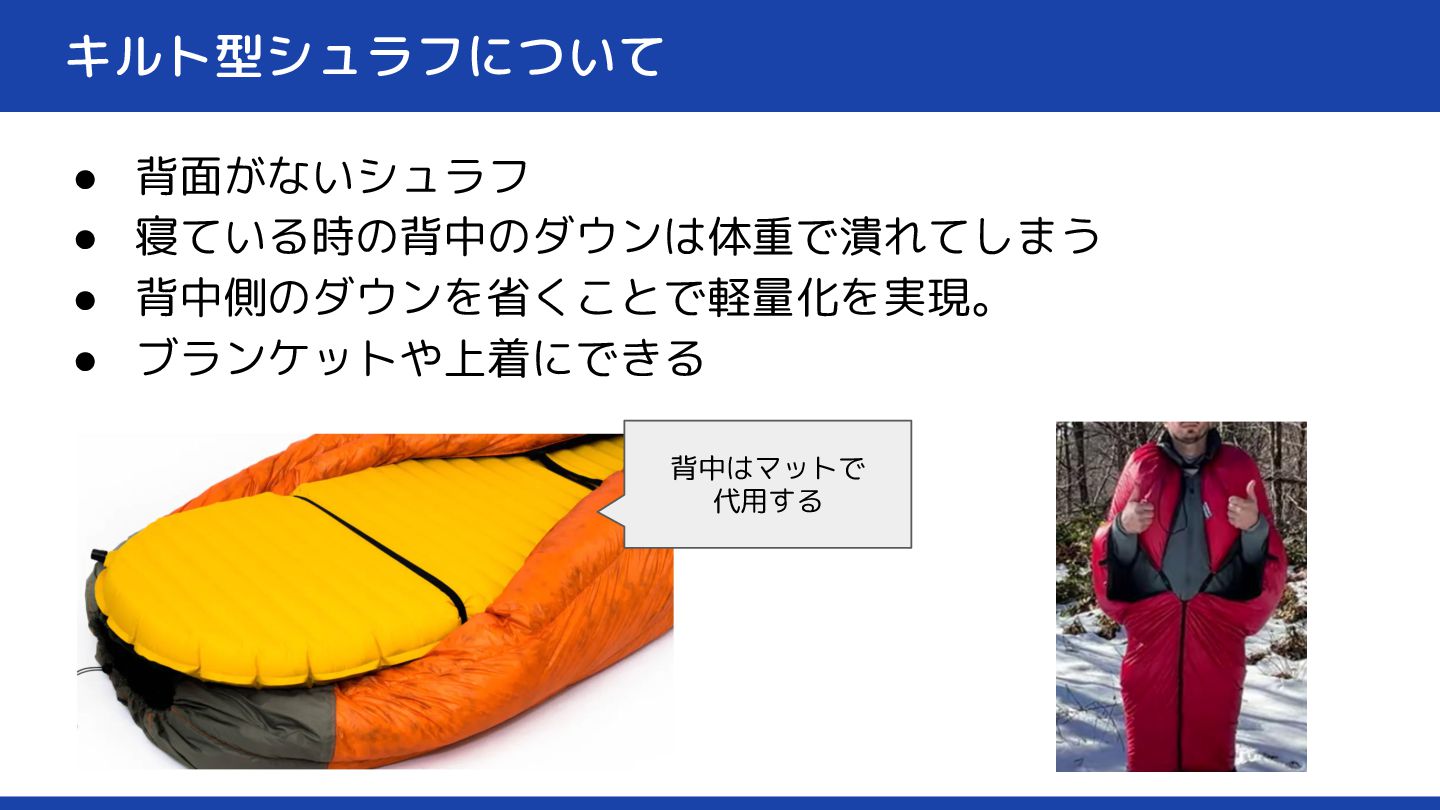 キルト型シュラフについて • 背面がないシュラフ • 寝ている時の背中のダウンは体重で潰れてしまう • 背中側のダウンを省くことで軽量化を実現。 • ブランケットや上着にできる 背中はマットで
