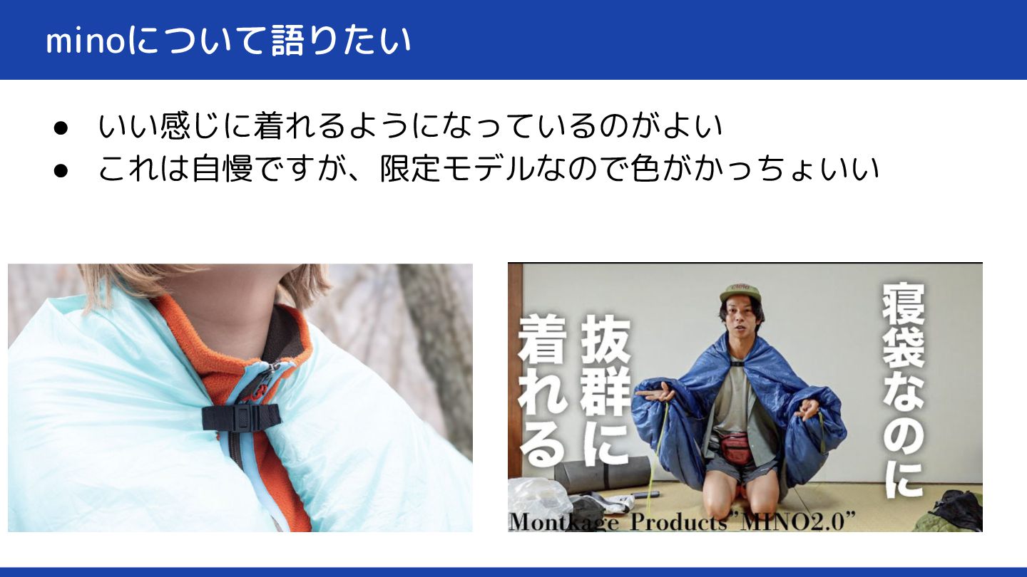 minoについて語りたい • いい感じに着れるようになっているのがよい • これは自慢ですが、限定モデルなので色がかっちょいい