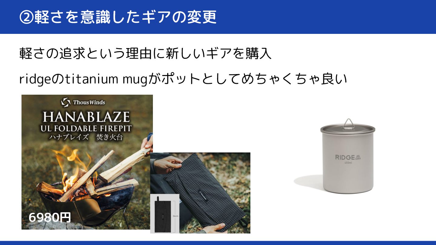 ②軽さを意識したギアの変更 軽さの追求という理由に新しいギアを購入 ridgeのtitanium mugがポットとしてめちゃくちゃ良い 6980円
