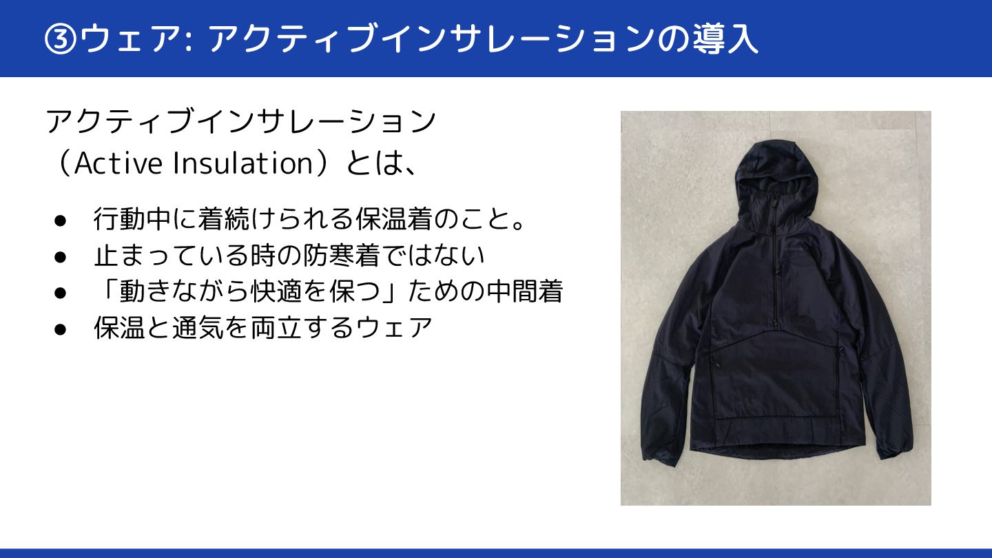 ③ウェア: アクティブインサレーションの導入 アクティブインサレーション (Active Insulation)とは、 • 行動中に着続けられる保温着のこと。 • 止まっている時の防寒着ではない •