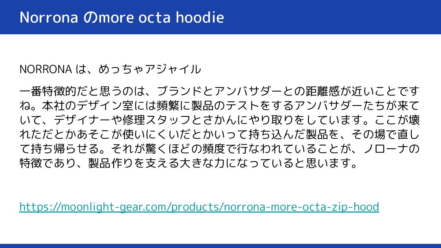 て持ち帰らせる。それが驚くほどの頻度で行なわれていることが、ノローナの 特徴であり、製品作りを支える大きな力になっていると思います。 https://moonlight-gear.com/products/norrona-more-octa-zip-hood
