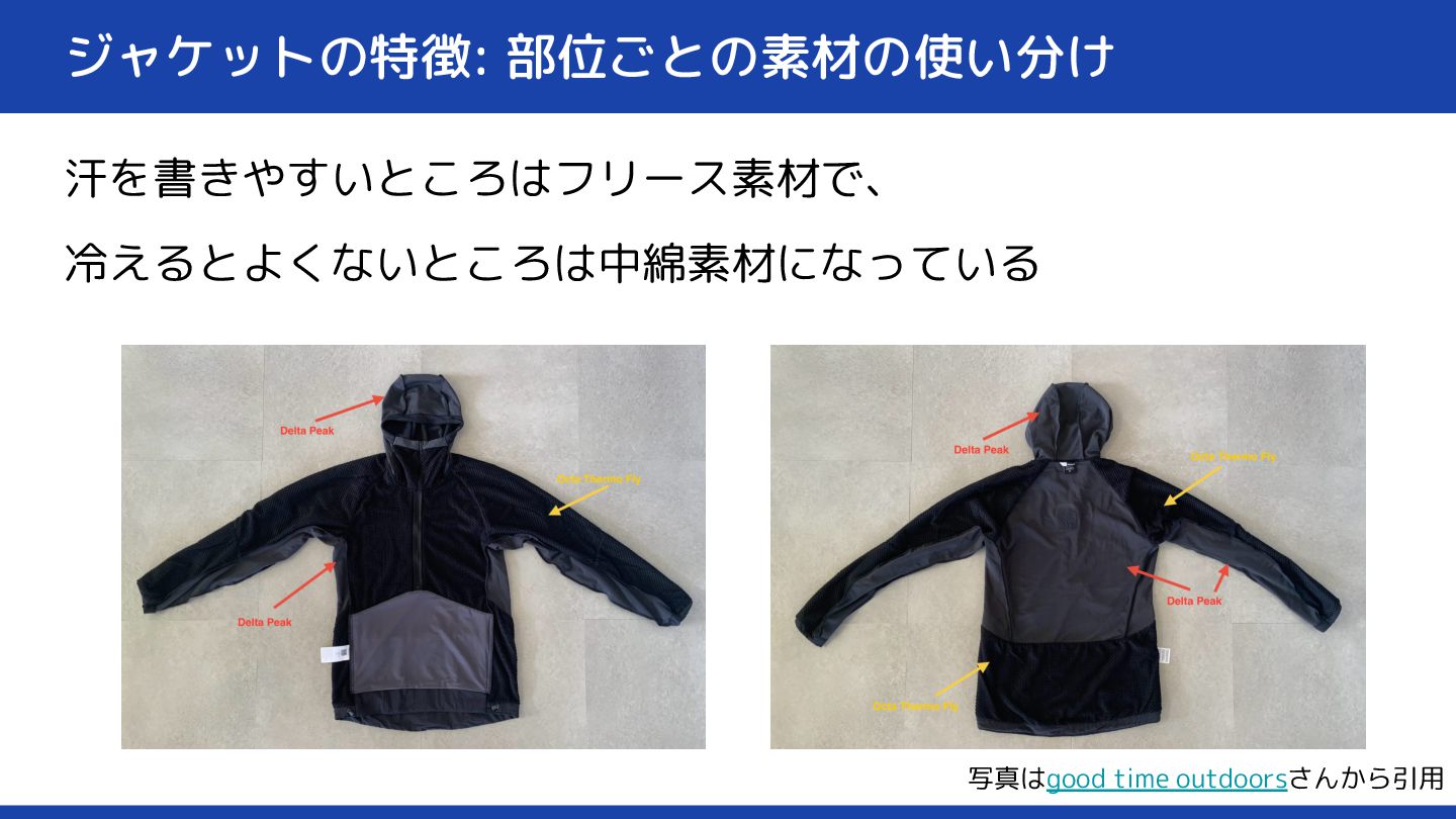 ジャケットの特徴: 部位ごとの素材の使い分け 汗を書きやすいところはフリース素材で、 冷えるとよくないところは中綿素材になっている 写真はgood time outdoorsさんから引用