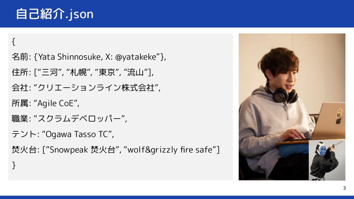 自己紹介.json { 名前: {Yata Shinnosuke, X: @yatakeke”}, 住所: [“三河”, “札幌”,