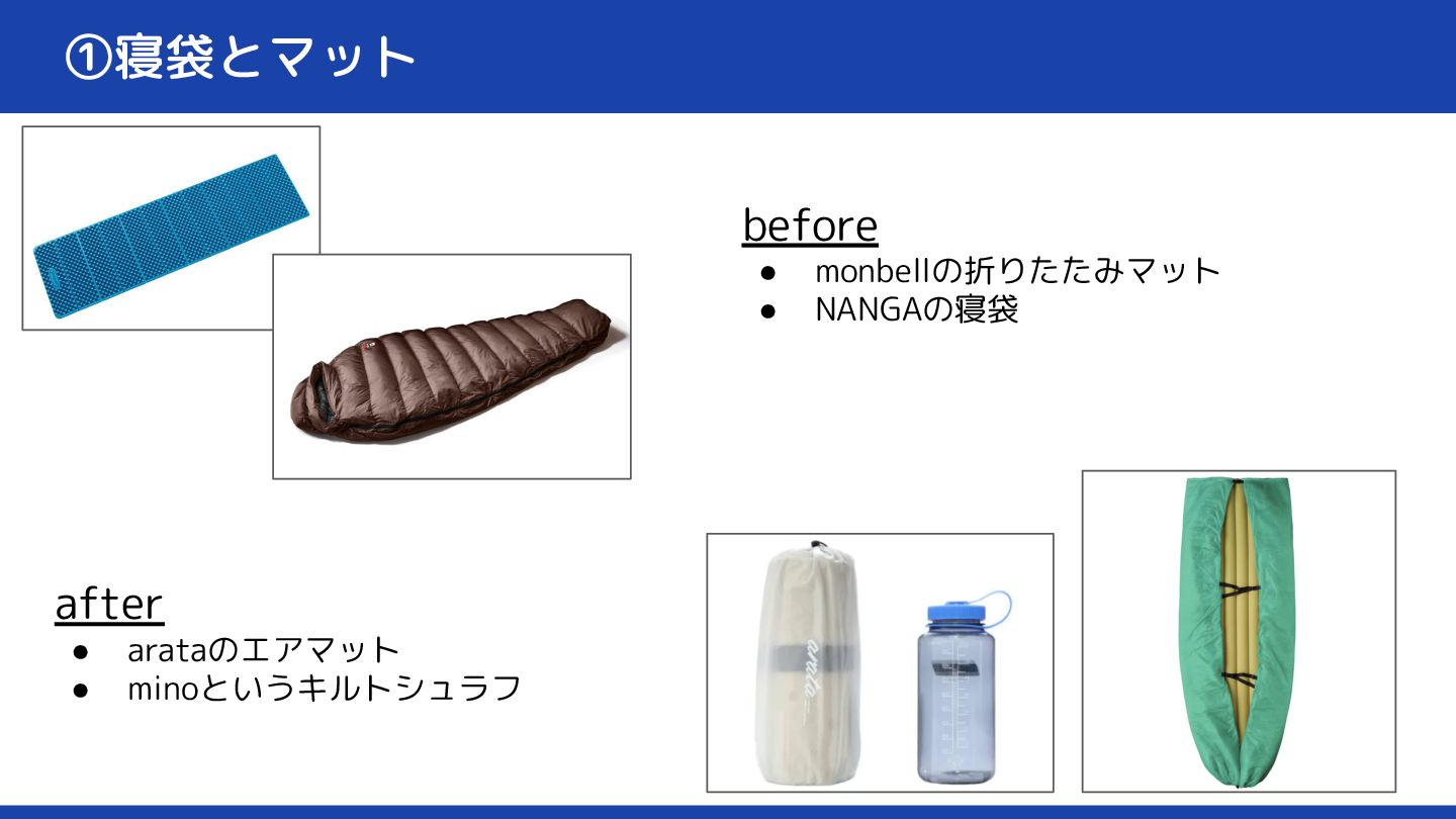 ①寝袋とマット before • monbellの折りたたみマット • NANGAの寝袋 after • arataのエアマット •