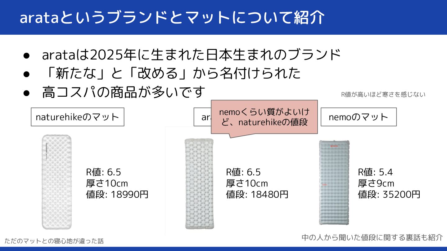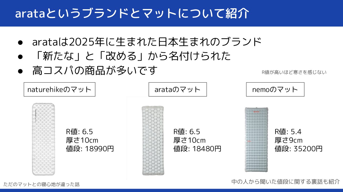 arataというブランドとマットについて紹介 • arataは2025年に生まれた日本生まれのブランド • 「新たな」と「改める」から名付けられた • 高コスパの商品が多いです R値: 6.5 厚さ10cm