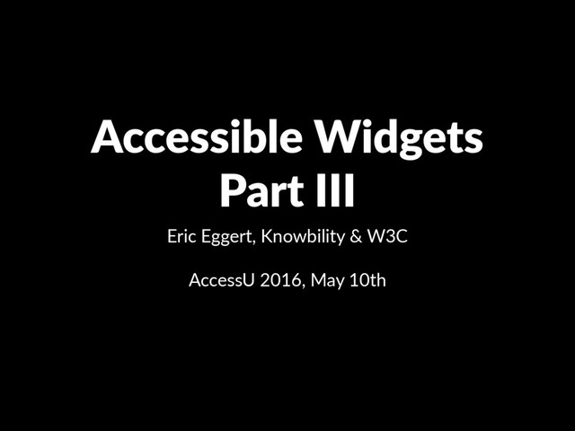 JBWS 165 Patrick Fox Focus management, Announcing dynamic content, Tool Ips, Modal dialogs, Dynamic table filtering and sorIng May 9th, 4:00-5:30 JBWS 163 Eric Eggert Date picker, Time field, Combo box, Progress bar May 10th, 10:15-11:45 JBWS 163 Eric Eggert Slider, Accordion, Tabs, Alerts May 10th, 2:15-3:45 JBWS 163 Patrick Fox Eric Eggert Wizard progress indicator, File selector and upload, Form validaIon, Search by locaIon, Dynamic applicaIon page elements and flow