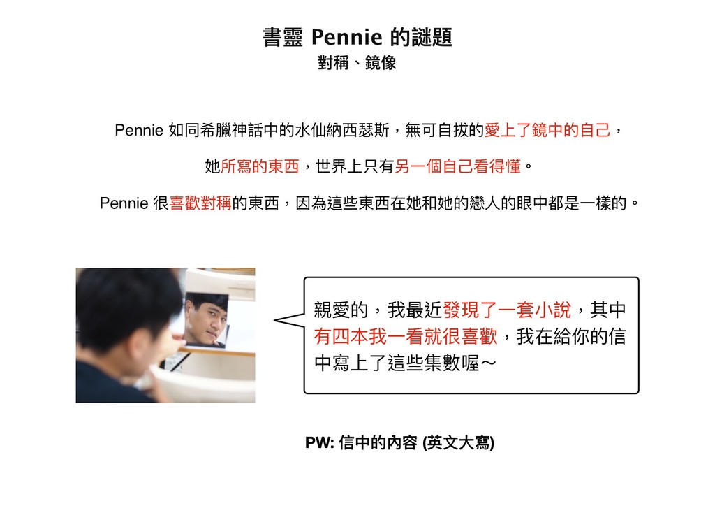 親愛的,我最近發現了了⼀一套⼩小說,其中 有四本我⼀一看就很喜歡,我在給你的信 中寫上了了這些集數喔~ Pennie 如同希臘神話中的⽔水仙納⻄西瑟斯,無可⾃自拔的愛上了了鏡中的⾃自⼰己, 她所寫的東⻄西,世界上只有另⼀一個⾃自⼰己看得懂。 Pennie 很喜歡對稱的東⻄西,因為這些東⻄西在她和她的戀⼈人的眼中都是⼀一樣的。 PW: 信中的內容