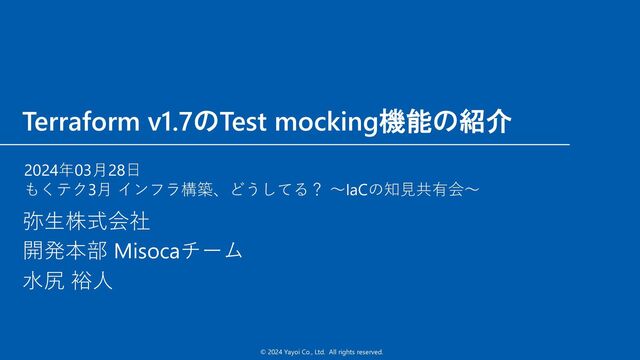 x.com/mizukmb github.com/mizukmb n ⽔尻 裕⼈ n 2020年6⽉ 弥⽣(株)転籍 n 2018年2⽉ (株)Misoca⼊社 n 弥⽣歴3年、Misoca開発歴6年のソフトウェアエンジニア n クラウド請求管理サービスMisocaのインフラ運⽤・SRE担当 n IaC歴 n Chef:2年ぐらい、オンプレサーバー構築やISUCON n Terraform:7年ぐらい、AWS環境構築