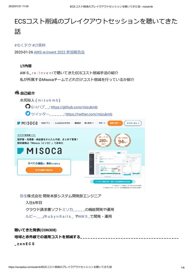 #LT資料 2023-01-26 AWS re:Invent 2022 参加報告会 📣 LT内容 AW S _ r e : I n v e n tで聴いてきたECSコスト削減手法の紹介 私が所属するMisocaチームでどれだけコスト削減を行っているか紹介 自己紹介 水尻裕人 ( m i z u k m b ) G i tハブ_ _: https://github.com/mizukmb ツイッター_ _ _ _ _ _: https://twitter.com/mizukmb 弥生株式会社 開発本部システム開発部エンジニア 入社6年目 クラウド請求書ソフトミソカ_ _ _ _ _の機能開発や運用 ルビー_ _ _/R u b y n R a i l s _ やAW S _で開発・運用 聴いてきた発表(CON308) 地球と赤外線での運用コストを削減する_ _ _ _ _ _ _ _ _ _ _ _ _ _ _ _ _ _ _ _ _ _ _ _ _ _ _ _ _ _ _ _ _ _ _ _ _ _ _ _ z o n E C S