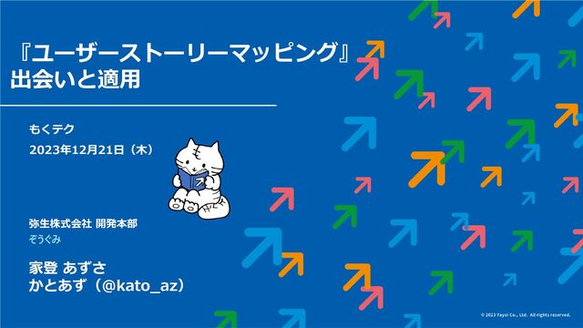 1 もくテク 2023年12月21日(木) 弥生株式会社 開発本部 ぞうぐみ 家登 あずさ かとあず(@kato_az) 『ユーザーストーリーマッピング』