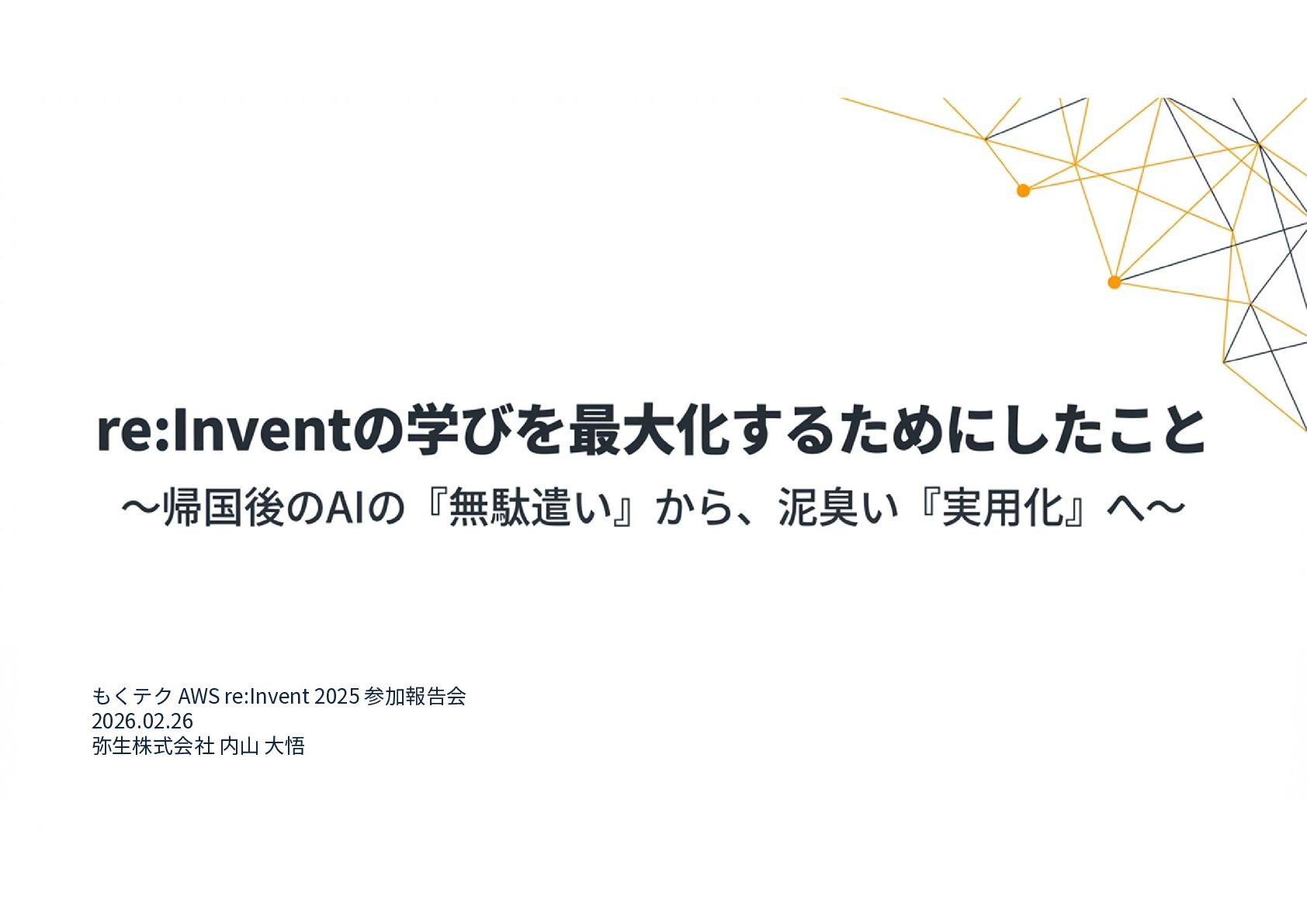 もくテク AWS re:Invent 2025 参加報告会 2026.02.26 弥生株式会社 内山 大悟