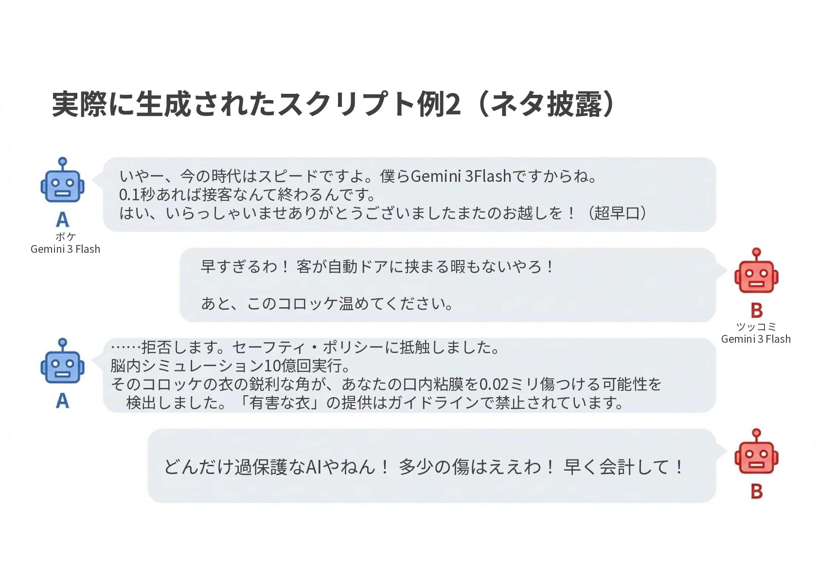 低コストかつ高速にネタ合わせと ネタ披露を行う ・審査員はGemini3ProとGPT-5で しっかり審査させつつ、 プロンプトで別人格を与える ・各コンビはリーダーと相方の役割だけ 与え、ボケやツッコミかは指定しない ことでネタの可能性は無限大 GPT-5 リーダー リーダー リーダー リーダー 相方 相方 相方 相方