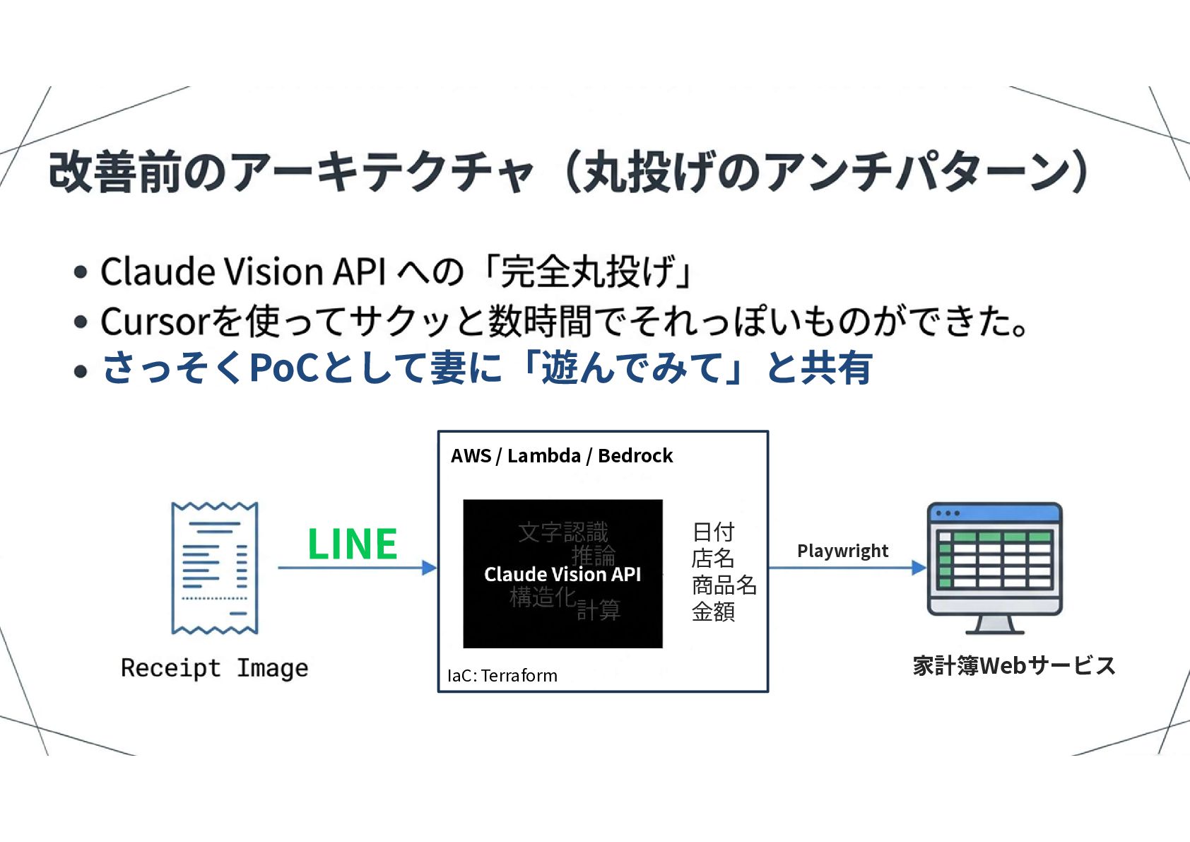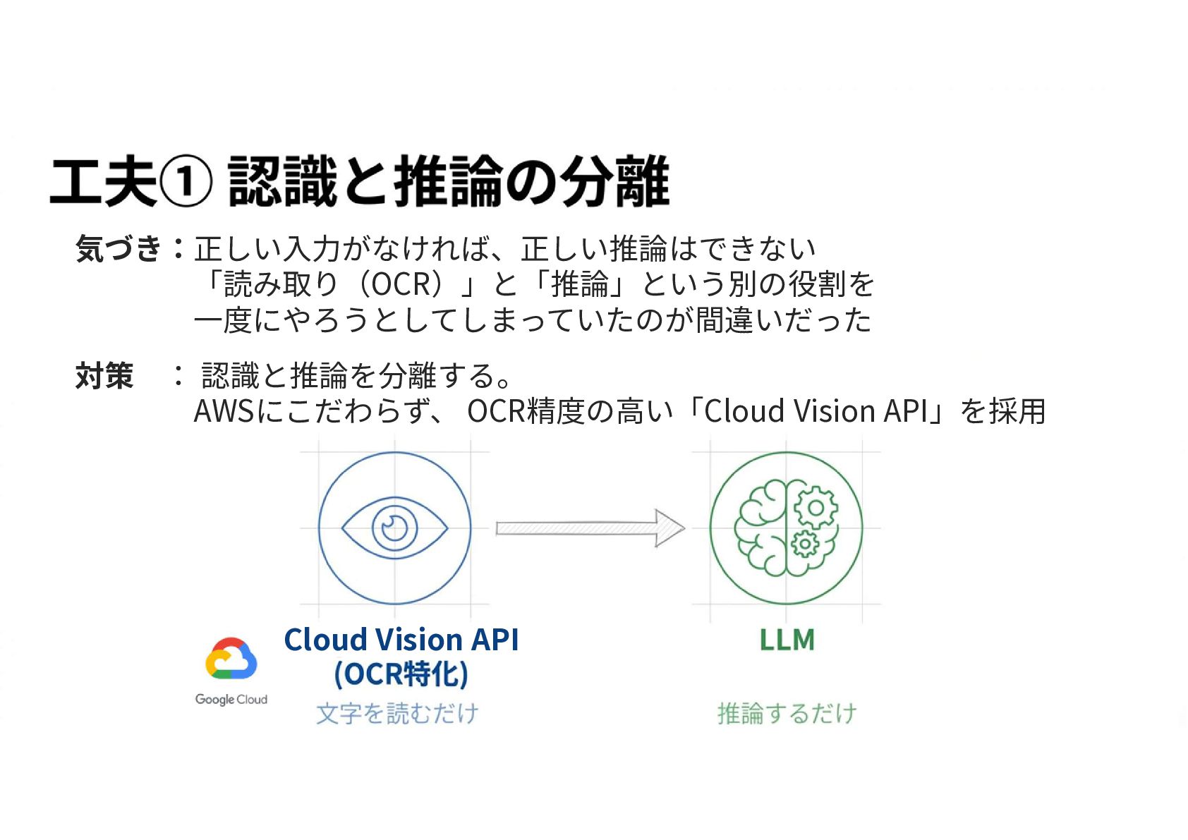 気づき:正しい入力がなければ、正しい推論はできない 「読み取り(OCR)」と「推論」という別の役割を 一度にやろうとしてしまっていたのが間違いだった 対策 : 認識と推論を分離する。 AWSにこだわらず、 OCR精度の高い「Cloud Vision API」を採用
