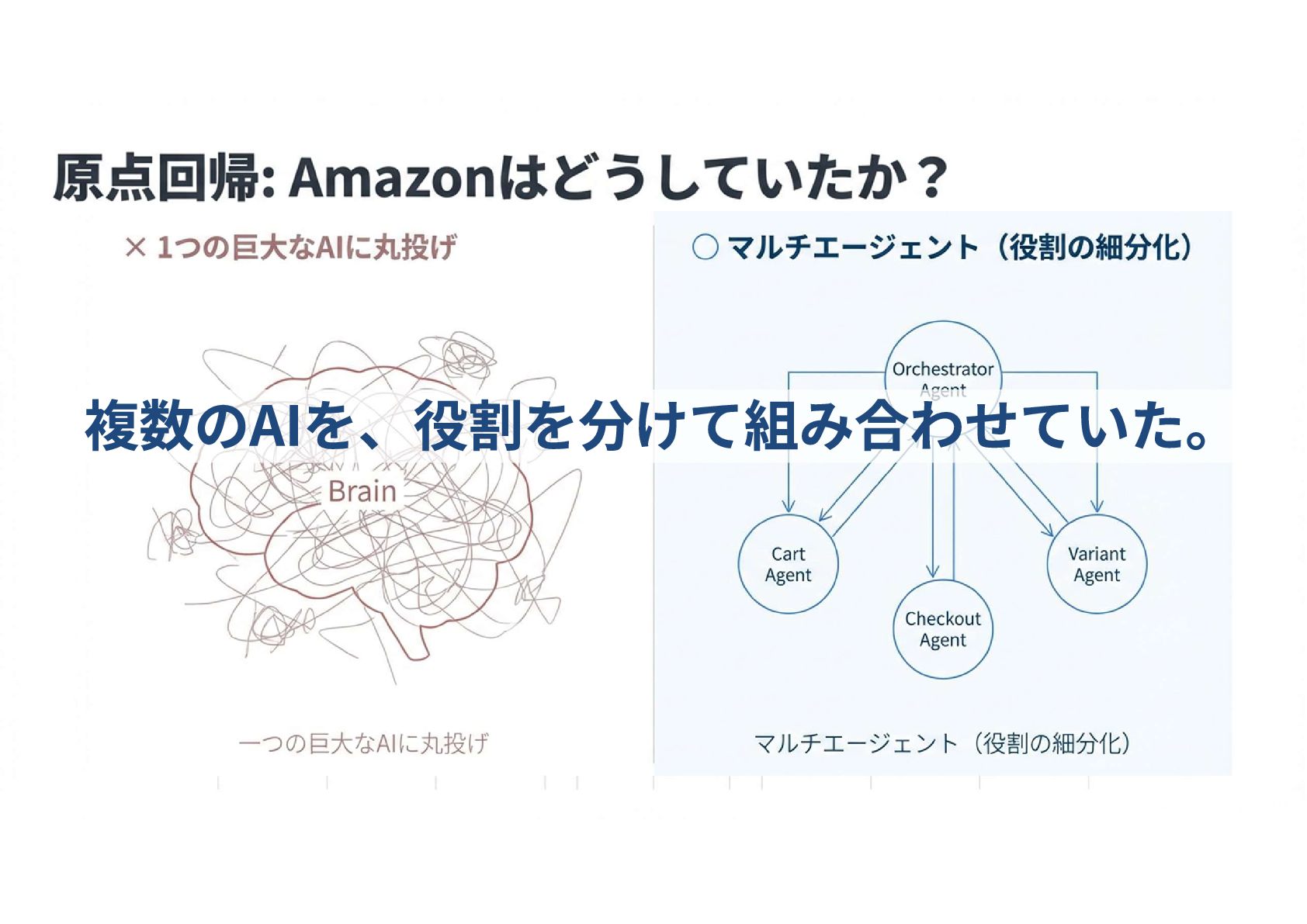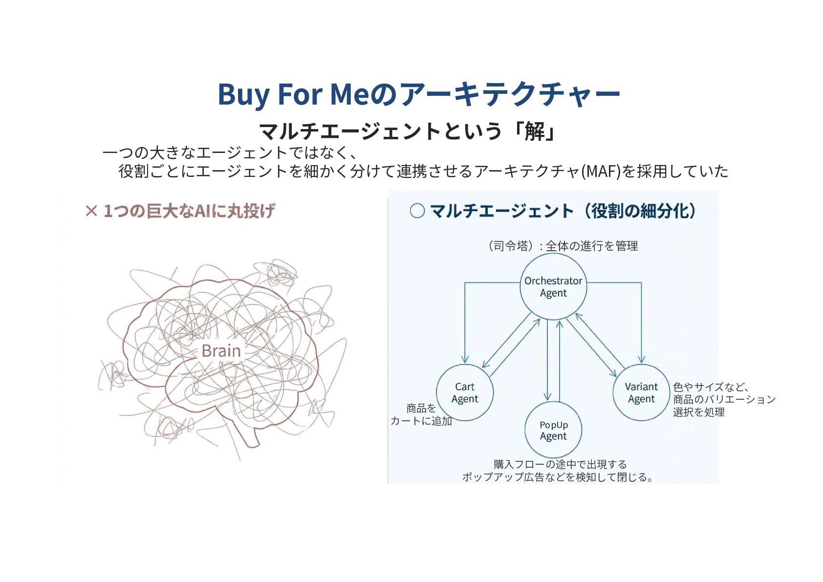 マルチエージェントという「解」 一つの大きなエージェントではなく、 役割ごとにエージェントを細かく分けて連携させるアーキテクチャ(MAF)を採用していた (司令塔): 全体の進行を管理 色やサイズなど、 商品のバリエーション 選択を処理 商品を カートに追加