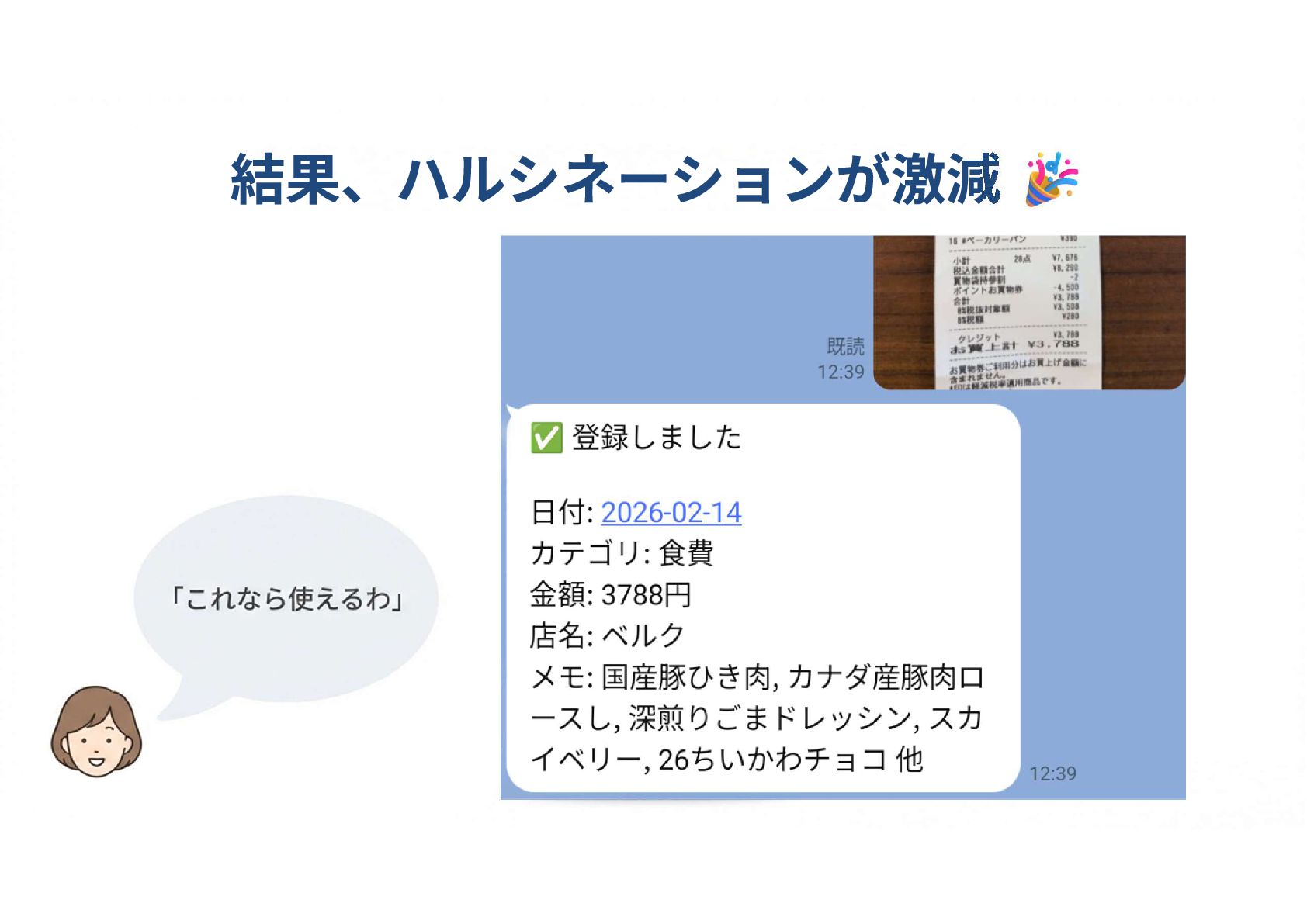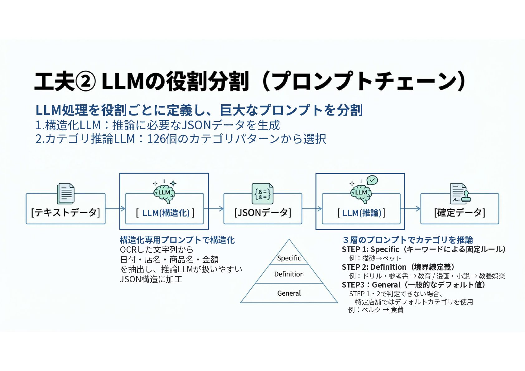 教育 / 漫画・小説 → 教養娯楽 STEP3:General(一般的なデフォルト値) STEP 1・2で判定できない場合、 特定店舗ではデフォルトカテゴリを使用 例:ベルク → 食費 構造化専用プロンプトで構造化 OCRした文字列から 日付・店名・商品名・金額 を抽出し、推論LLMが扱いやすい JSON構造に加工 LLM処理を役割ごとに定義し、巨大なプロンプトを分割 1.構造化LLM:推論に必要なJSONデータを生成 2.カテゴリ推論LLM:126個のカテゴリパターンから選択 LLM(構造化) LLM(推論)