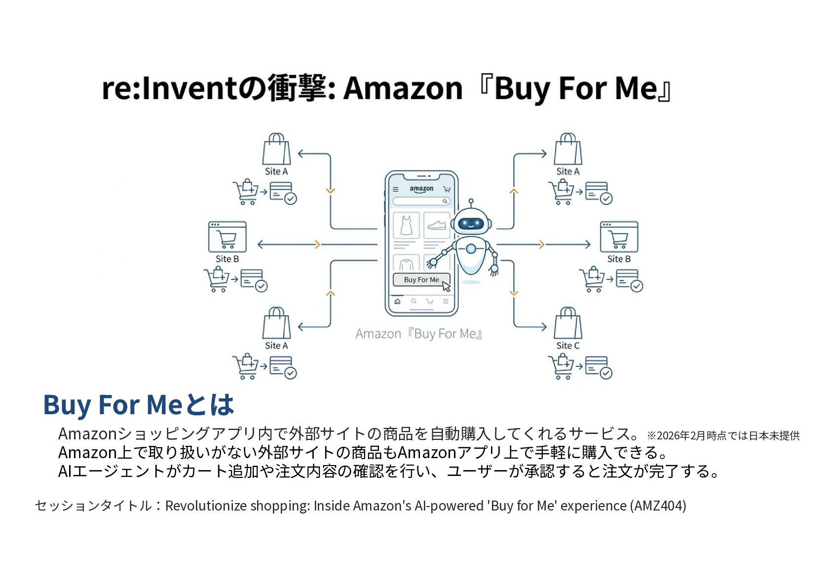 Amazonショッピングアプリ内で外部サイトの商品を自動購入してくれるサービス。※2026年2月時点では日本未提供 Amazon上で取り扱いがない外部サイトの商品もAmazonアプリ上で手軽に購入できる。 AIエージェントがカート追加や注文内容の確認を行い、ユーザーが承認すると注文が完了する。 セッションタイトル:Revolutionize shopping: Inside Amazon's AI-powered 'Buy for