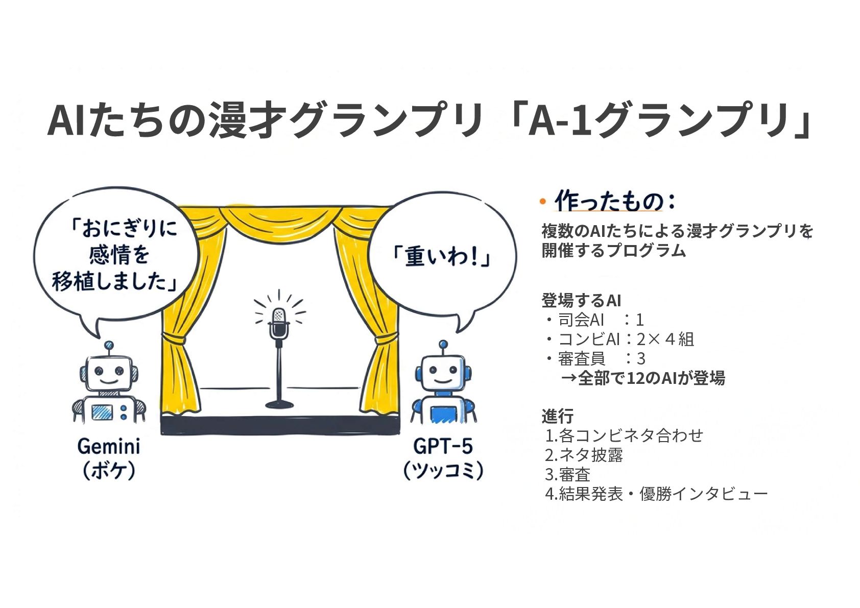 複数のAIたちによる漫才グランプリを 開催するプログラム 登場するAI ・司会AI :1 ・コンビAI:2×4組 ・審査員 :3 →全部で12のAIが登場 進行