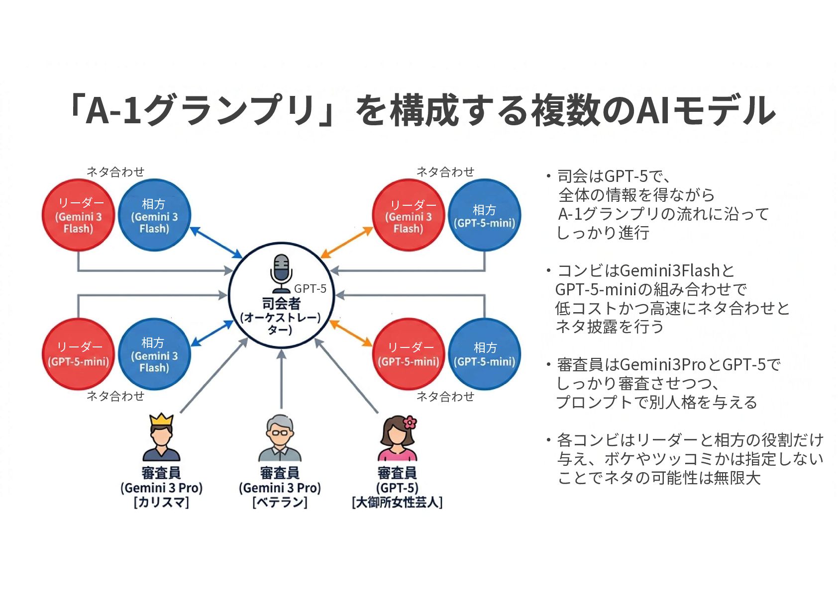 ネタ合わせ ネタ合わせ ネタ合わせ ネタ合わせ ・司会はGPT-5で、 全体の情報を得ながら A-1グランプリの流れに沿って しっかり進行 ・コンビはGemini3Flashと GPT-5-miniの組み合わせで