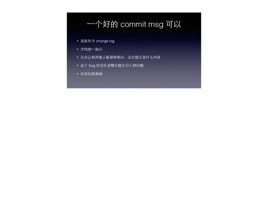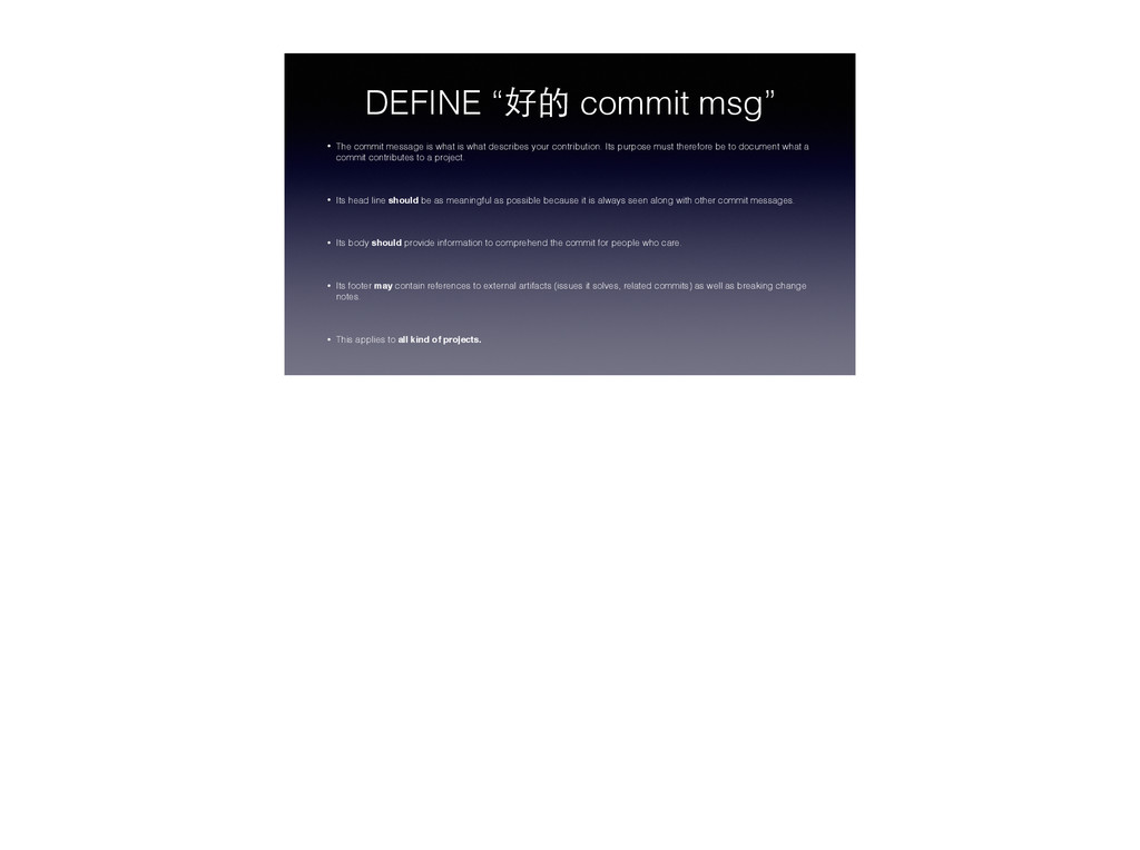 is what describes your contribution. Its purpose must therefore be to document what a commit contributes to a project. ! • Its head line should be as meaningful as possible because it is always seen along with other commit messages. ! • Its body should provide information to comprehend the commit for people who care. ! • Its footer may contain references to external artifacts (issues it solves, related commits) as well as breaking change notes. ! • This applies to all kind of projects.
