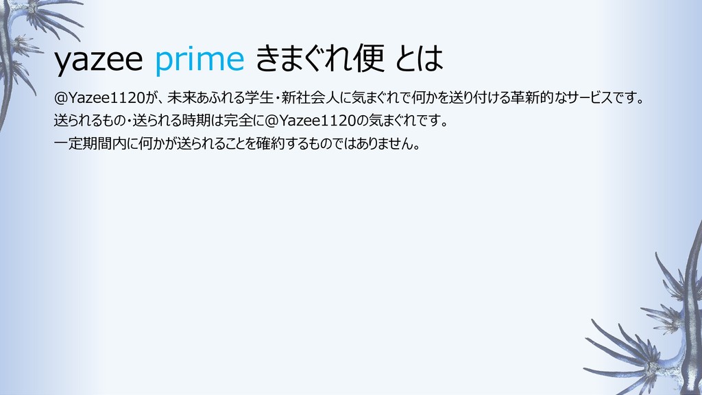 yazee prime きまぐれ便 とは @Yazee1120が、未来あふれる学生・新社会人に気まぐれで何かを送り付ける革新的なサービスです。 送られるもの・送られる時期は完全に@Yazee1120の気まぐれです。 一定期間内に何かが送られることを確約するものではありません。