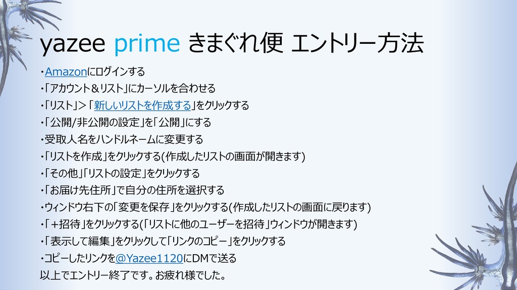 yazee prime きまぐれ便 エントリー方法 ・Amazonにログインする ・「アカウント&リスト」にカーソルを合わせる ・「リスト」>「新しいリストを作成する」をクリックする ・「公開/非公開の設定」を「公開」にする ・受取人名をハンドルネームに変更する ・「リストを作成」をクリックする(作成したリストの画面が開きます)