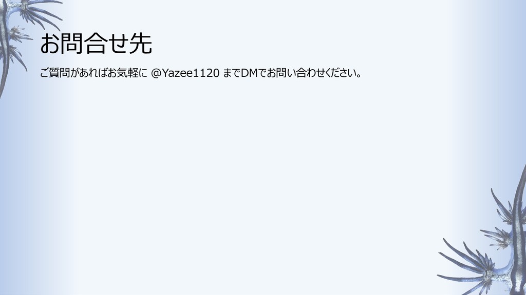 お問合せ先 ご質問があればお気軽に @Yazee1120 までDMでお問い合わせください。