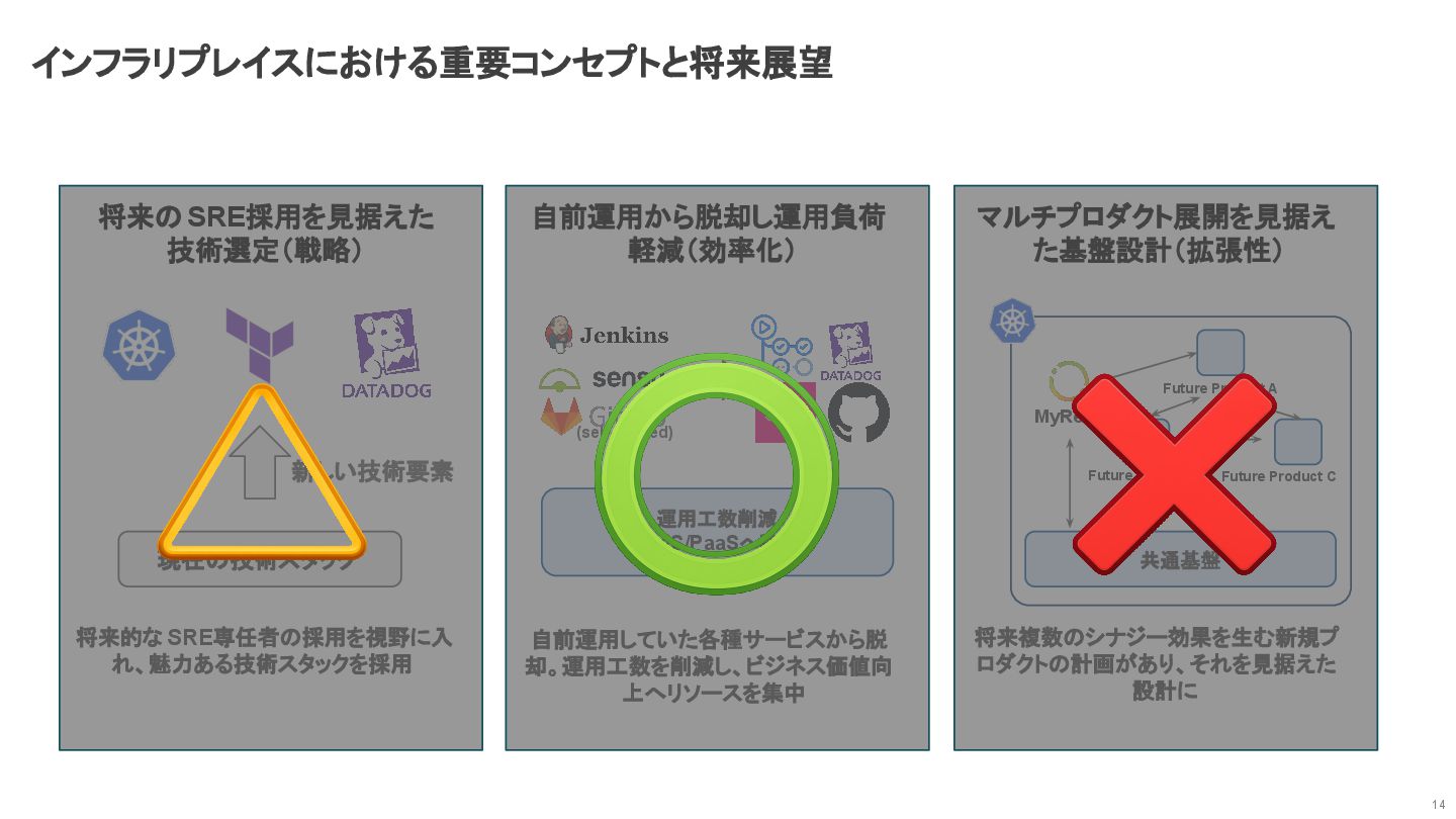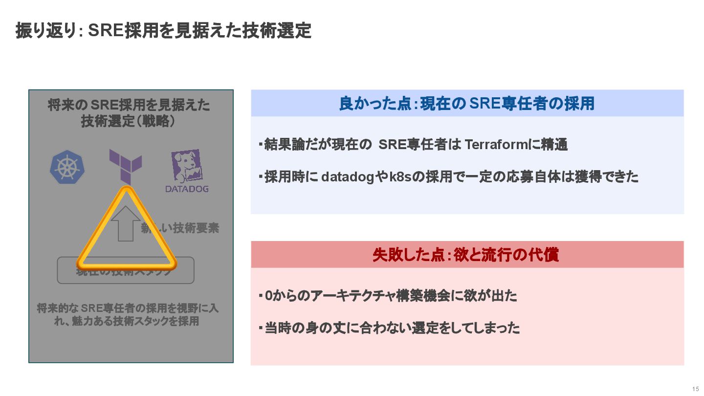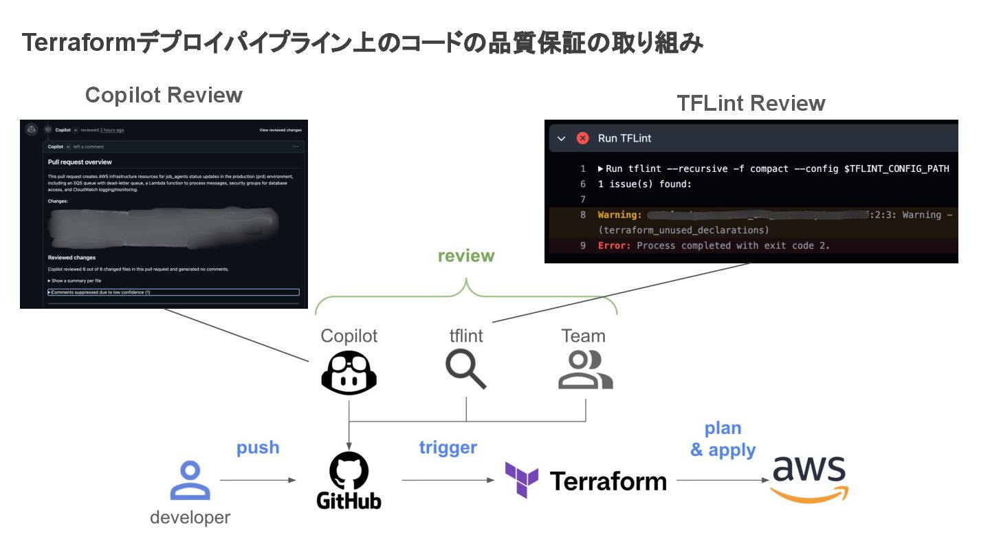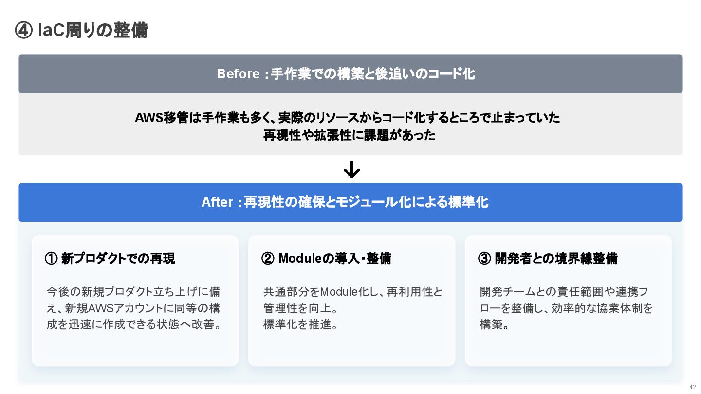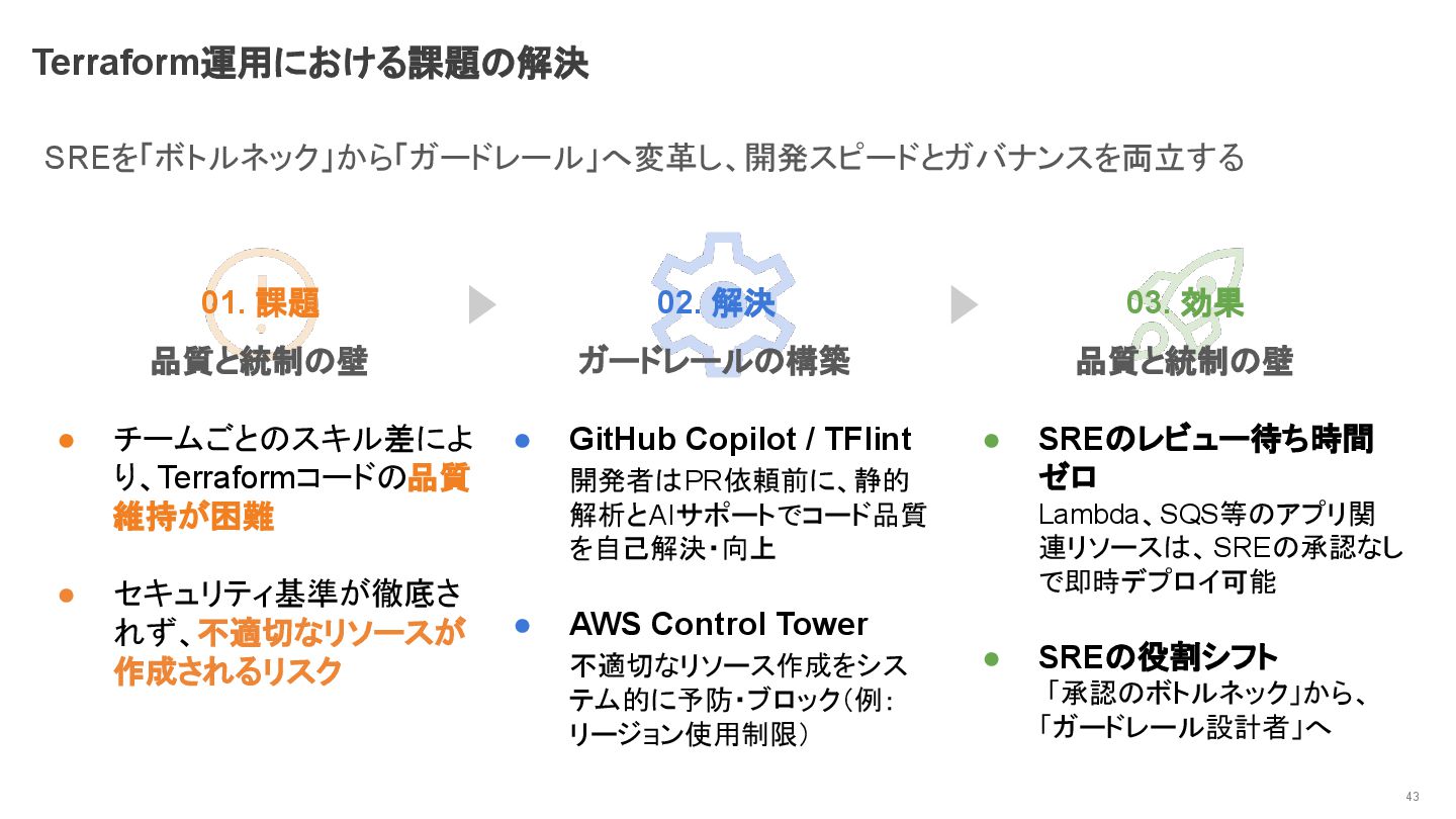 作成されるリスク 03. 効果 品質と統制の壁 • SREのレビュー待ち時間 ゼロ Lambda、SQS等のアプリ関 連リソースは、SREの承認なし で即時デプロイ可能 • SREの役割シフト 「承認のボトルネック」から、 「ガードレール設計者」へ 02. 解決 ガードレールの構築 • GitHub Copilot / TFlint 開発者はPR依頼前に、静的 解析とAIサポートでコード品質 を自己解決・向上 • AWS Control Tower 不適切なリソース作成をシス テム的に予防・ブロック(例: リージョン使用制限) Terraform運用における課題の解決 43 SREを「ボトルネック」から「ガードレール」へ変革し、開発スピードとガバナンスを両立する