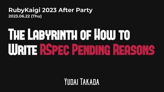 'xxx' end it 'does something' do pending 'xxx' raise 'should not get here' end end RSpec.describe Foo do pending 'xxx' do # ... end skip 'xxx' do # ... end end 🙆 🙅